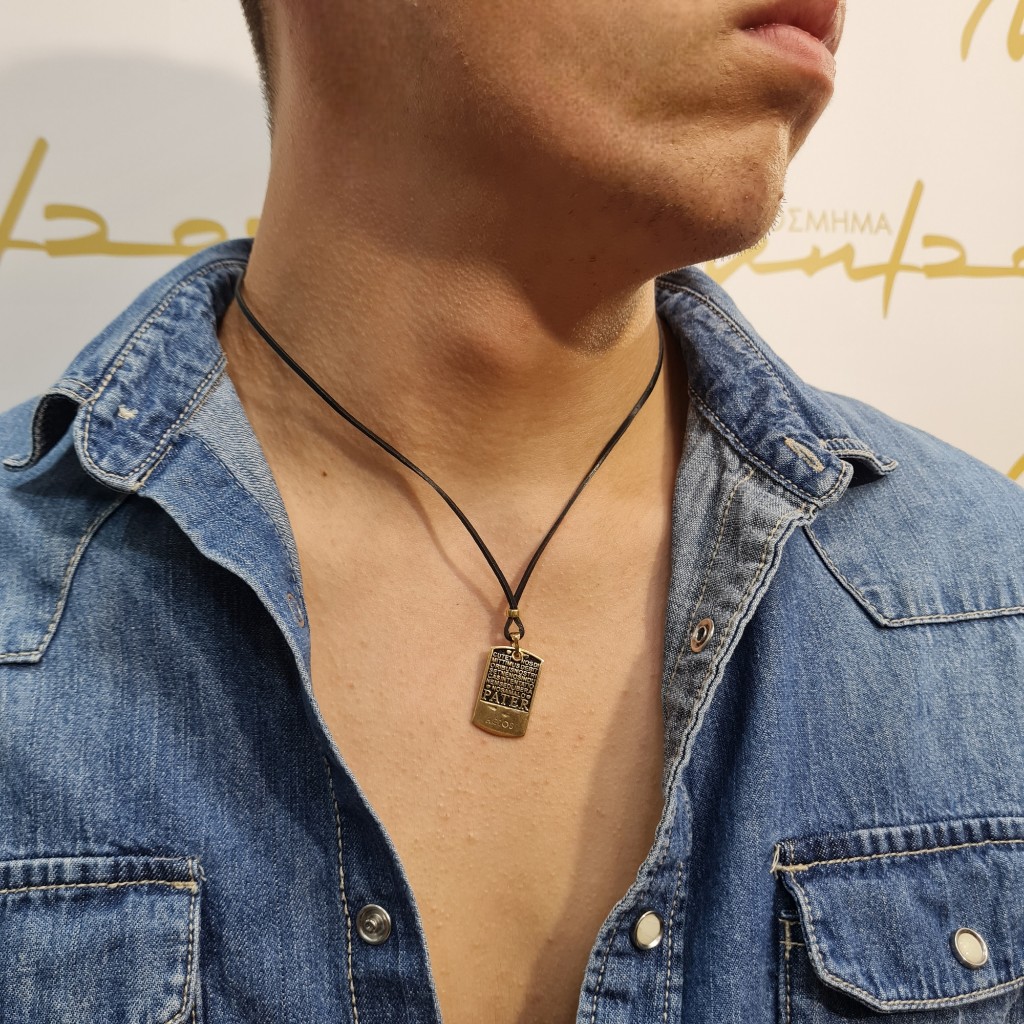 Adjustable cotton rope necklace with 16x26mm plaque pendant in Rhodium or Gold silver with Our Father engraved in relief in Latin