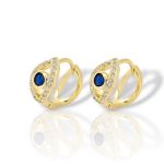 Orecchini in argento placcato oro con zirconi bianchi a forma di occhio, con zaffiro sintetico al centro.