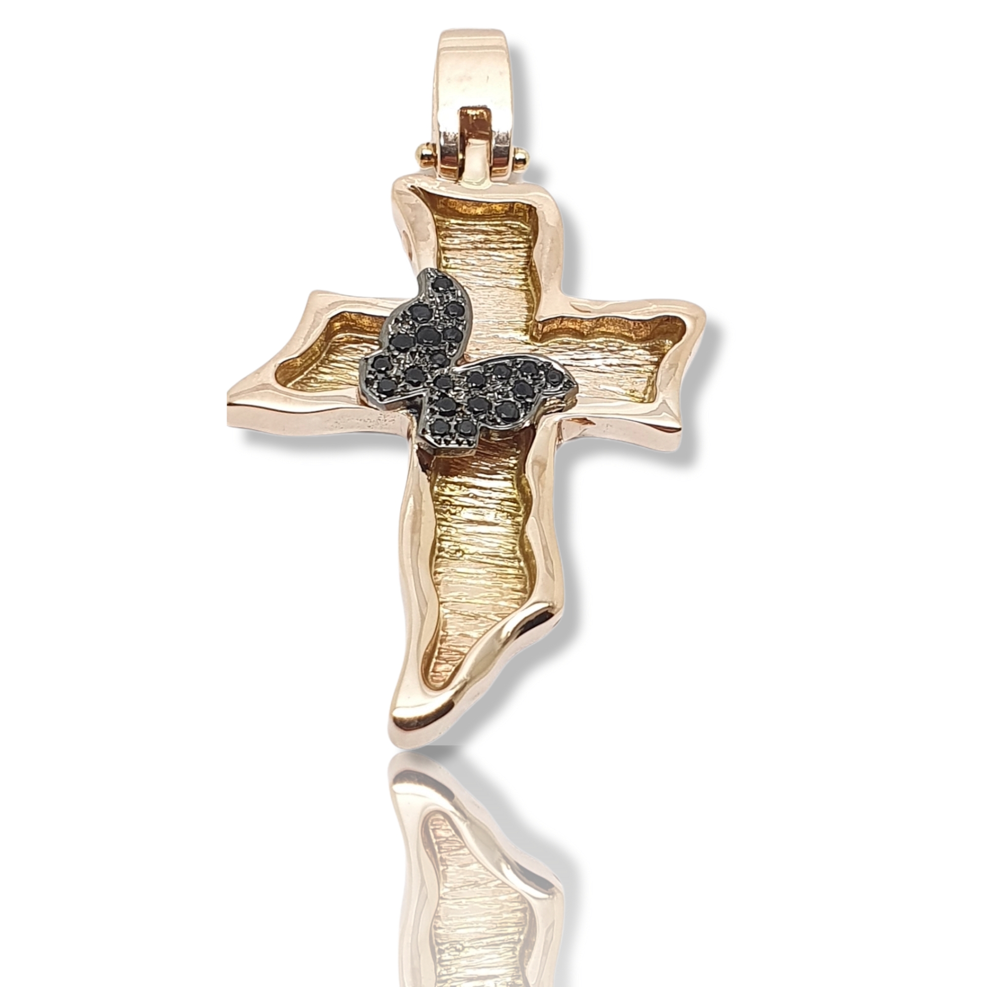 Croce in oro Rosa con farfalla e zirconi cubici neri