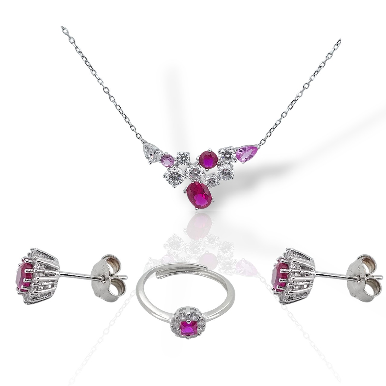 Λαμπερό σετ κοσμημάτων από επιπλατινωμένο ασήμι 925 που περιλαμβάνει ένα κομψό κολιέ και σκουλαρίκια. Διακοσμημένο με αστραφτερά ζιργκόν σε ροζ και λευκή απόχρωση, το σετ προσφέρει διαχρονική κομψότητα και ιδανική λάμψη για κάθε περίσταση.