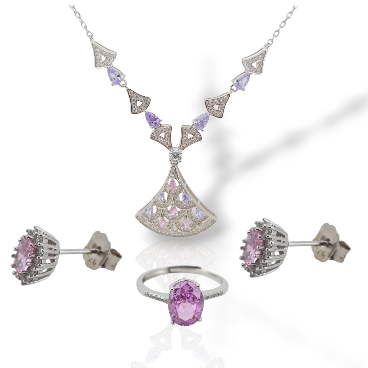 Ασημένιο Επιπλατινωμένο Σετ Κολιέ και Σκουλαρίκια με Ζιργκόν σε Ροζ και Λευκό (M2833)