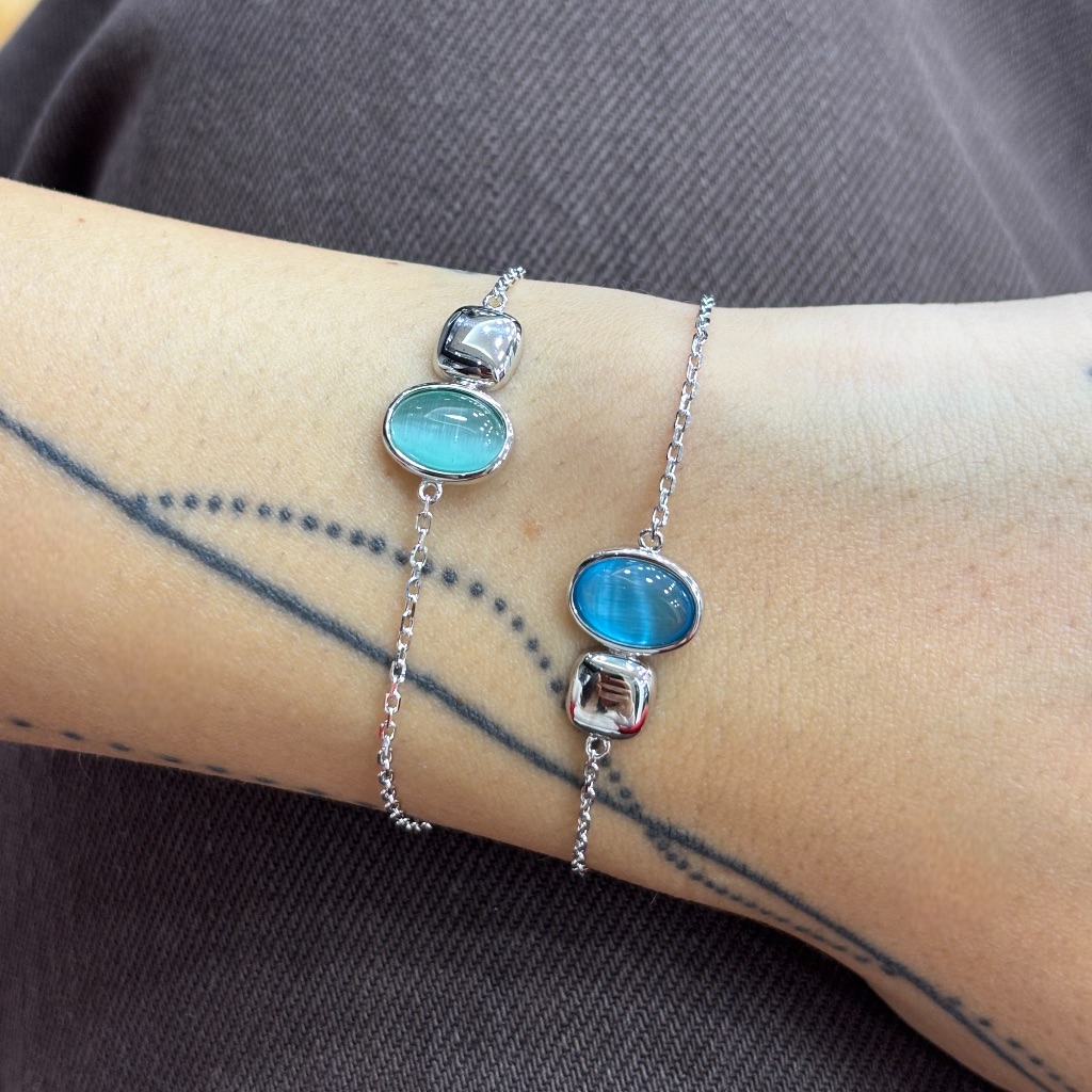 Κομψό ασημένιο βραχιόλι με εντυπωσιακή χρωματιστή συνθετική πέτρα τύπου «μάτι της γάτας». Ένα μοναδικό κόσμημα που ξεχωρίζει για το ιδιαίτερο παιχνίδισμα του φωτός, προσφέροντας στυλ και διακριτική λάμψη σε κάθε εμφάνιση.