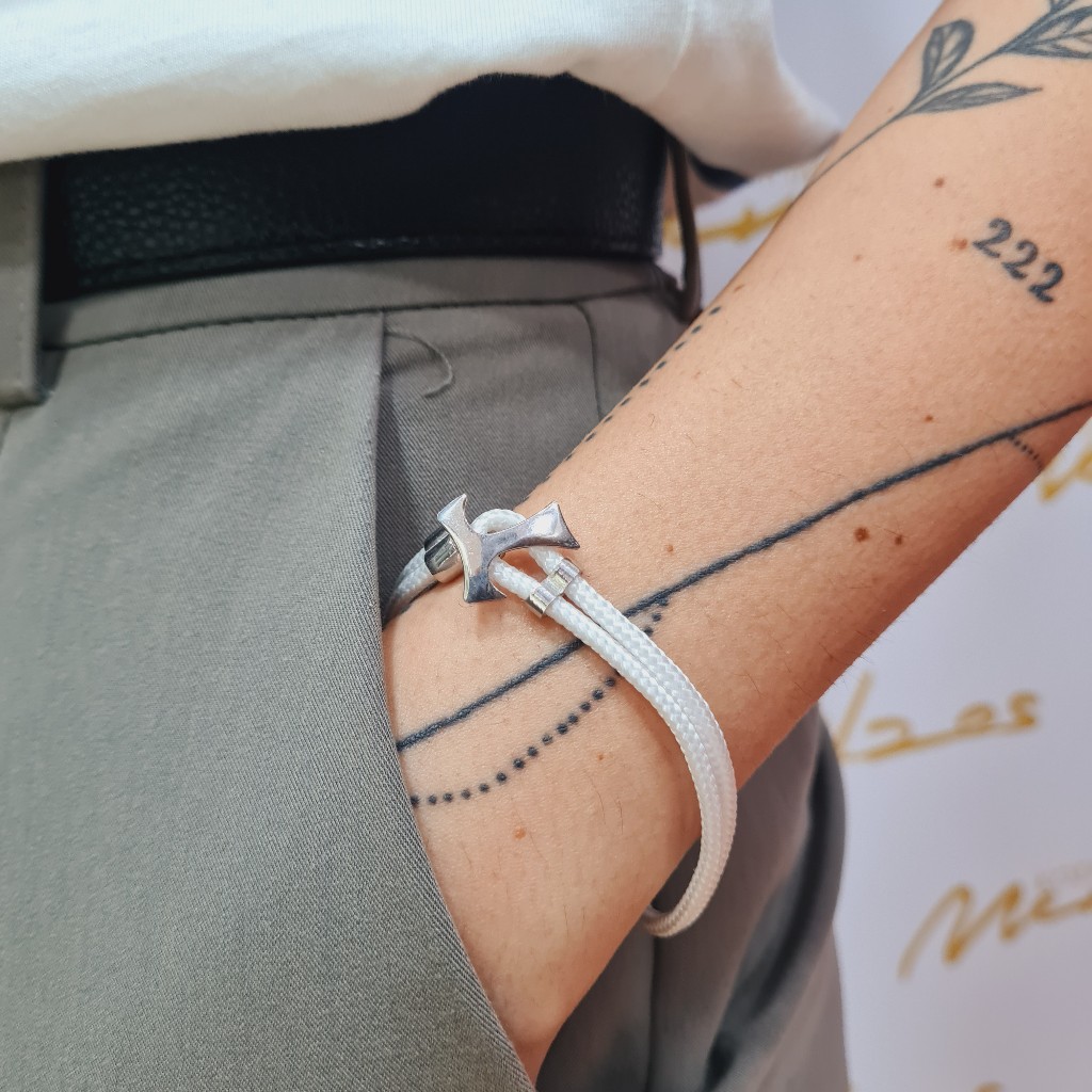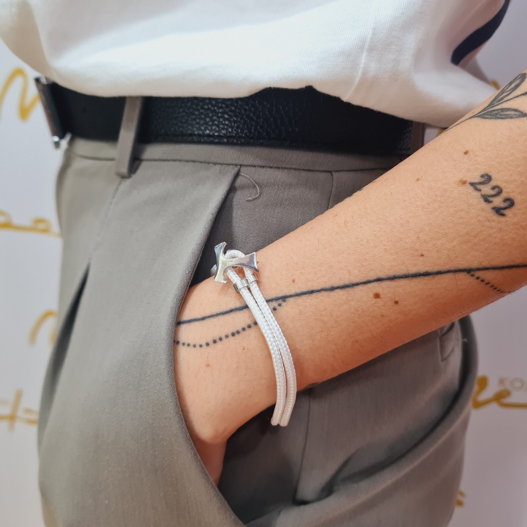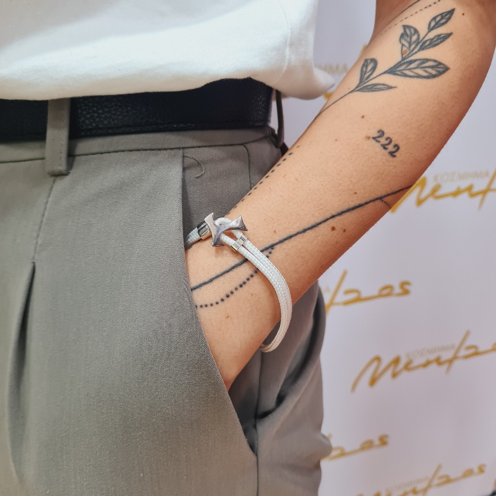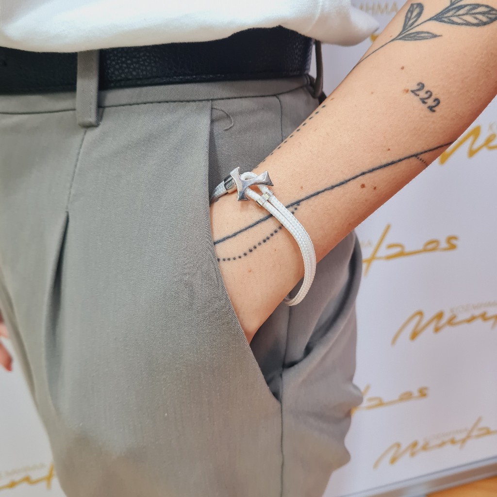 Βραχιόλι απο λευκό συνθετικό κορδόνι, με ασημένιες λεπτομέρειες στο κούμπωμα του και κατα μήκος του βραχιολιού. Aπο την σειρά "VINCULUM FIDEI".