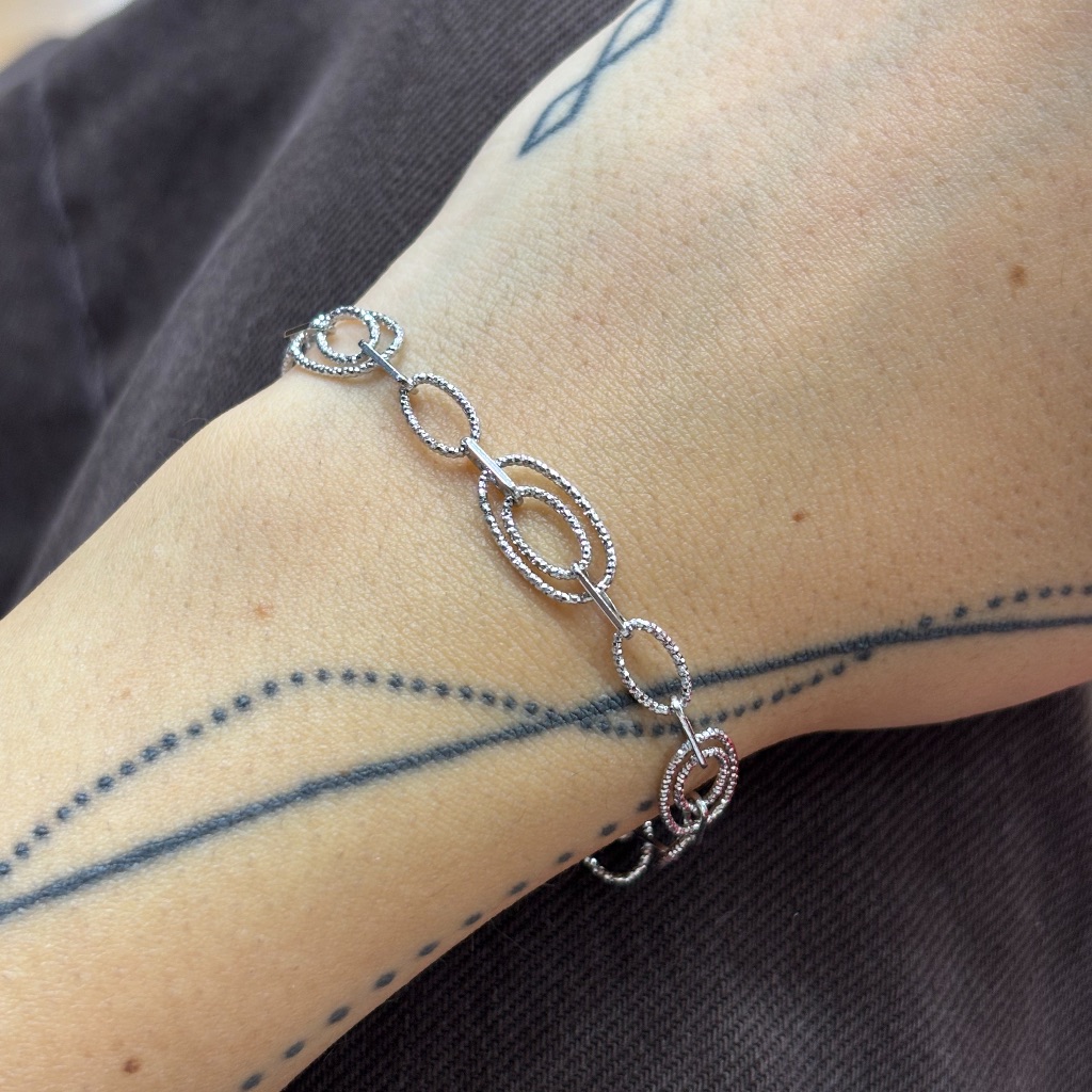 Κομψό ασημένιο βραχιόλι σε μοντέρνο σχέδιο. Διαθέτει λεπτή αλυσίδα με ρυθμιζόμενο μήκος και κούμπωμα τύπου καβουράκι. Μίνιμαλ αισθητική, ιδανικό για καθημερινή ή βραδινή εμφάνιση.