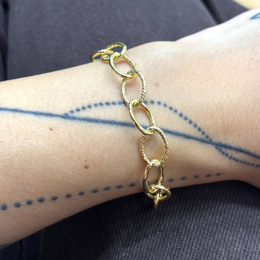 Βραχιόλι από επιχρυσωμένο ασήμι, με κρίκους που δημιουργούν έναν κομψό και μοντέρνο σχεδιασμό. Το απλό αλλά ταυτόχρονα εντυπωσιακό στυλ του, καθιστά το βραχιόλι ιδανικό για καθημερινή χρήση, προσφέροντας μία αίσθηση πολυτέλειας και φινέτσας στον καρπό.