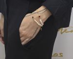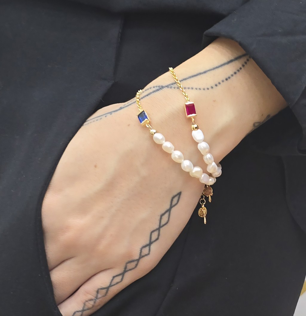Κομψό επιχρυσωμένο βραχιόλι διακοσμημένο με πέρλες και λαμπερά ζιργκόν. Ο σταυρός τύπου ροζάριο προσθέτει μια διακριτική πινελιά πίστης και στυλ. Ιδανικό για να φορεθεί μόνο του ή σε συνδυασμό με άλλα κοσμήματα για ένα μοντέρνο, εκλεπτυσμένο look.