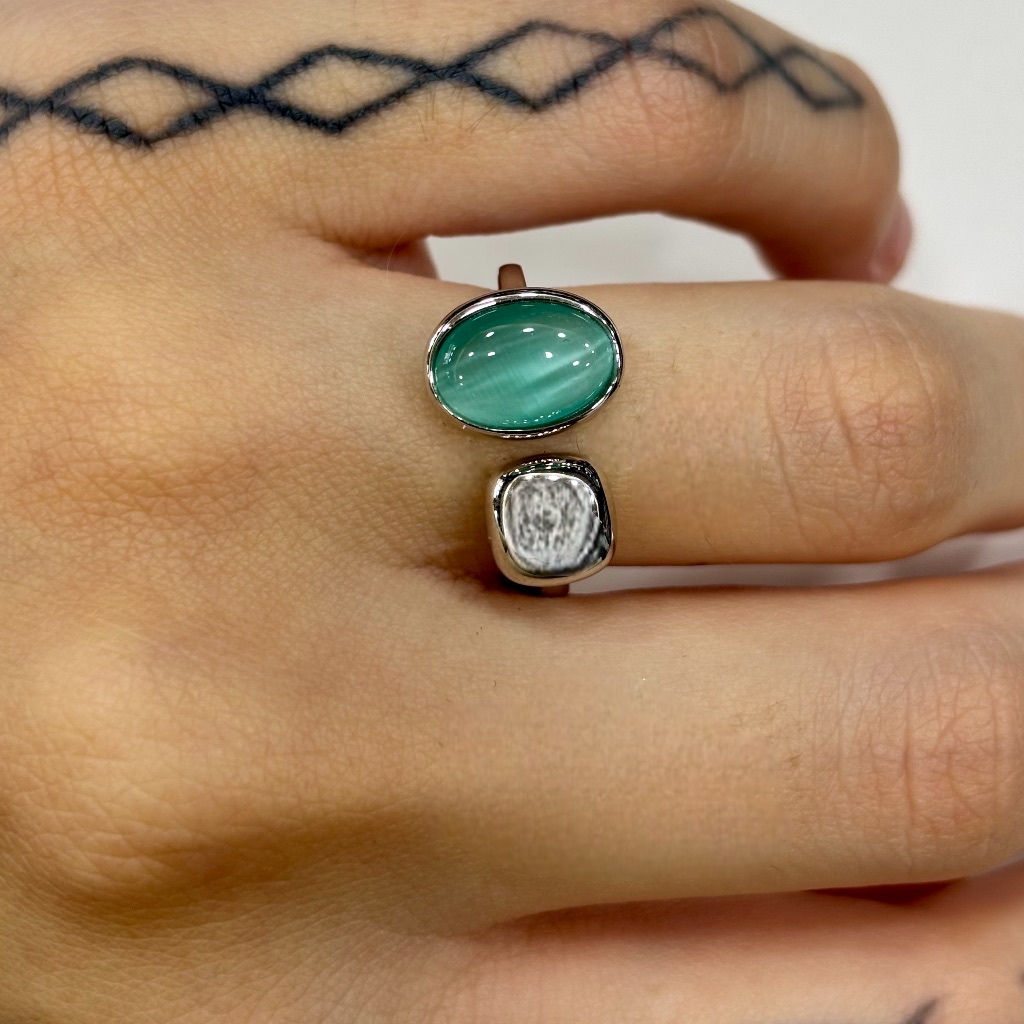 Δαχτυλίδι απο επιπλατινωμένο ασήμι 925º με συνθετική cat eye πέτρα.
