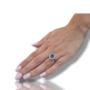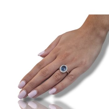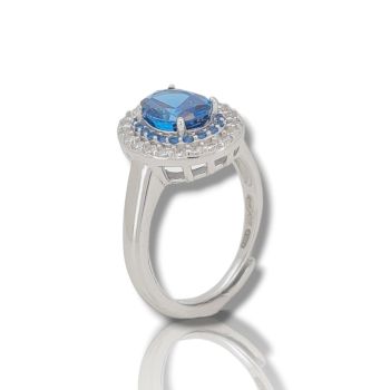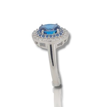 Δαχτυλίδι απο επιπλατινωμένο ασήμι 925º και λευκά ζιργκόν και συνθετικό μπλέ τοπάζι 6mm x 8.5mm