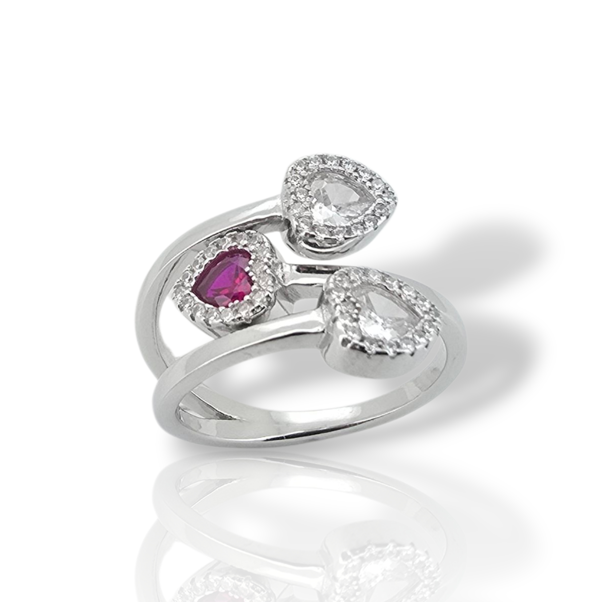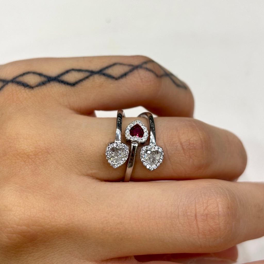 Κομψό ασημένιο δαχτυλίδι διακοσμημένο με τρεις καρδιές από συνθετικές πέτρες – δύο λευκές και μία κόκκινη. Ιδανικό για να εκφράσετε την αγάπη και το πάθος με στυλ.