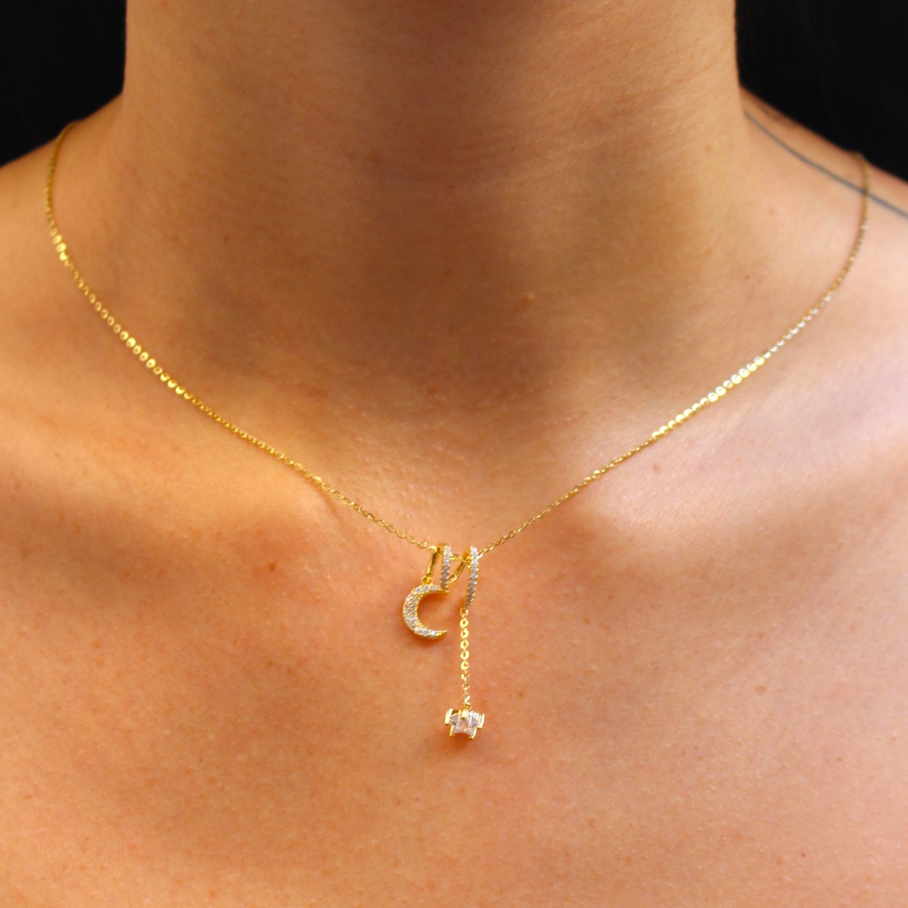 Κομψό κολιέ από ασήμι επίχρυσο , διακοσμημένο με διακριτικό κρεμαστό φεγγάρι και αστεράκι. Ένα διαχρονικό κόσμημα που χαρίζει λάμψη, θηλυκότητα και μια αίσθηση ουράνιας μαγείας σε κάθε εμφάνιση.