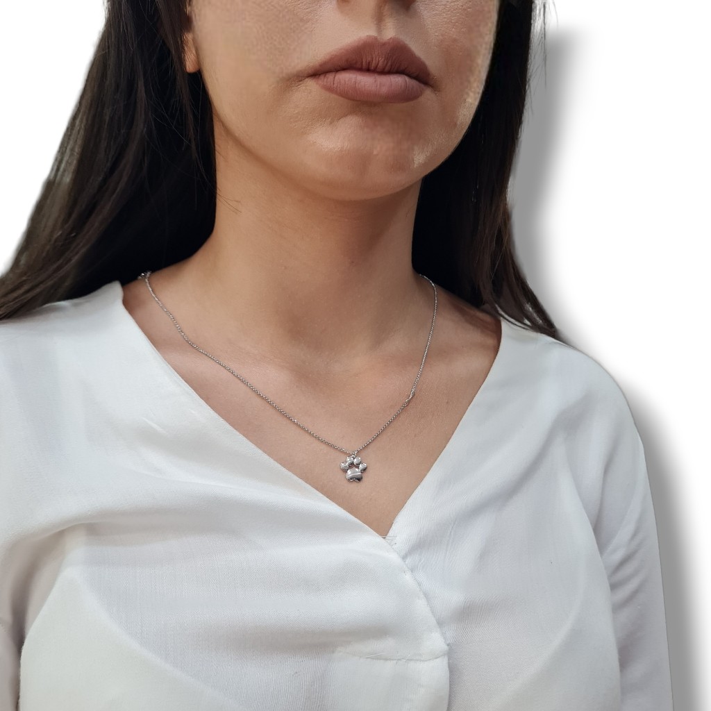 Ασημένιο, επιπλατινωμένο κολιέ με πατουσάκι σκύλου και κόκαλο