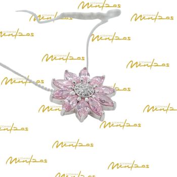 Kολιέ ασημένιο 925° επιπλατινωμένο με ροζ συνθετικές πέτρες σε σχήμα λουλουδιού με λευκό ζιργκόν στο κέντρο