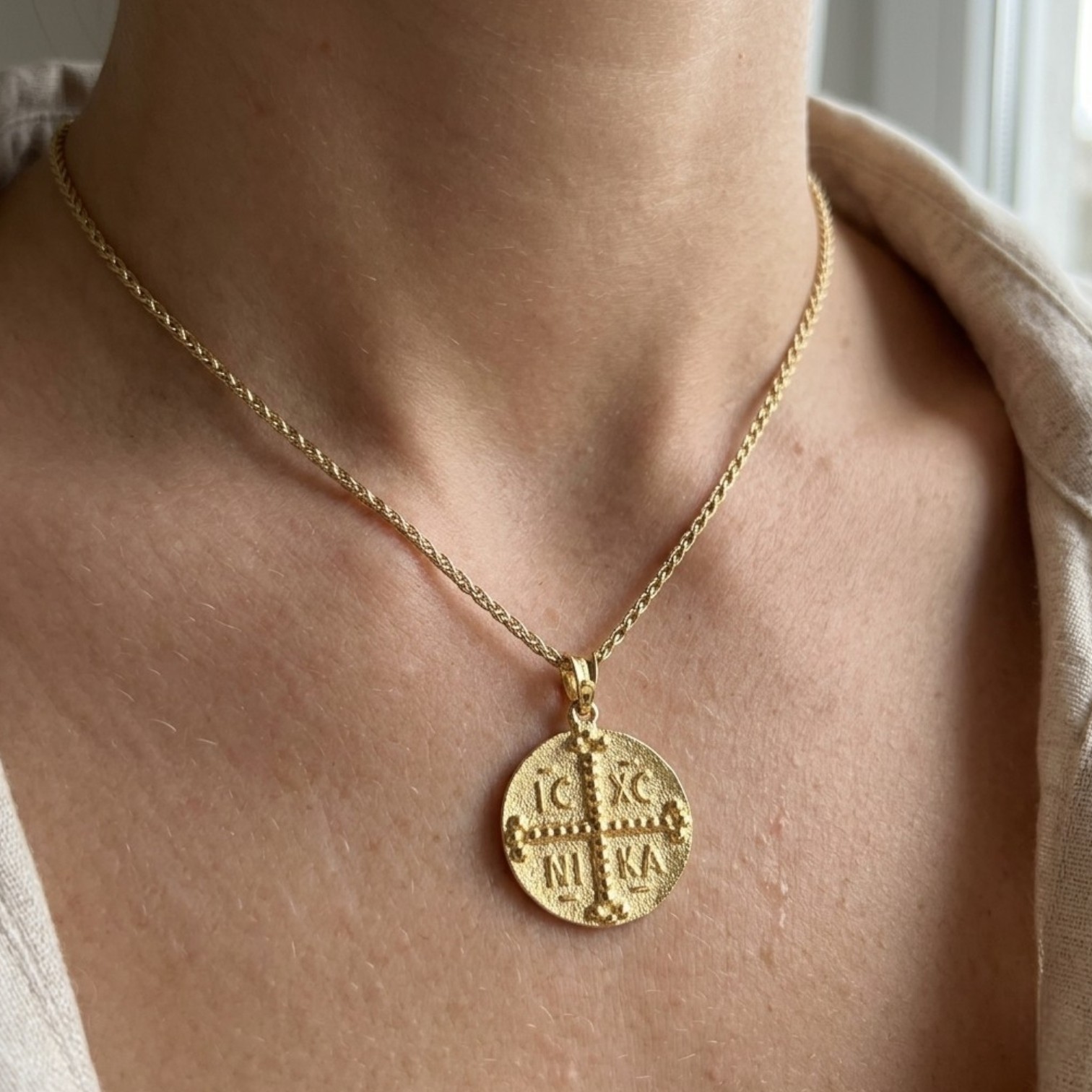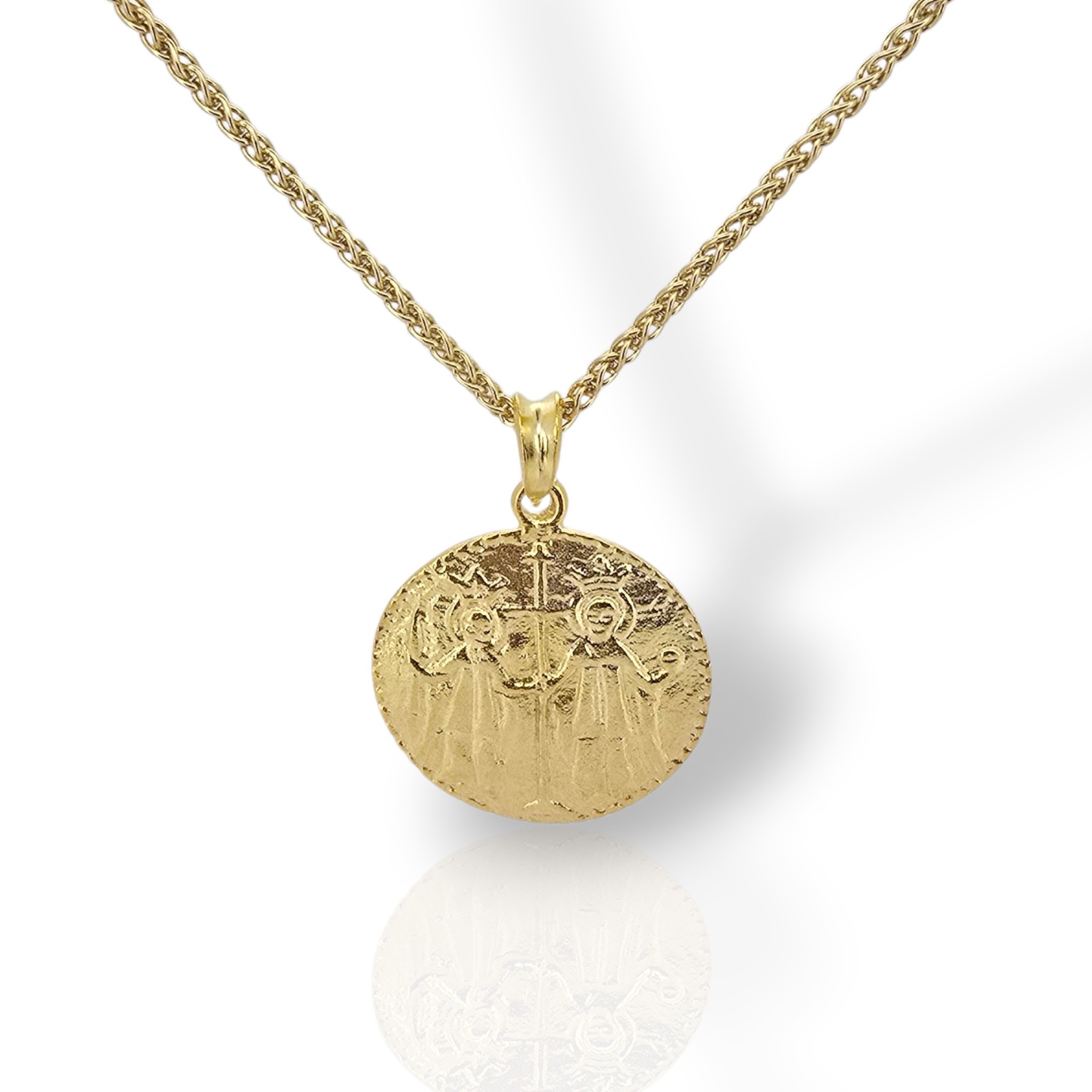 Ένα κλασικό και διαχρονικό κόσμημα με βαθιά παράδοση. Αυτό το χειροποίητο Κωνσταντινάτο είναι κατασκευασμένο από ασήμι 925 με επιχρύσωση, προσφέροντας την τέλεια ισορροπία μεταξύ πολυτέλειας και ανθεκτικότητας. Στη μία όψη απεικονίζονται οι Άγιοι Κωνσταντίνος και Ελένη, ενώ η πίσω όψη φέρει το παραδοσιακό "IC XC NI KA". Συνοδεύεται από κομψή επίχρυση αλυσίδα, αποτελώντας ένα ιδανικό δώρο φυλαχτό για εσάς ή τους αγαπημένους σας.