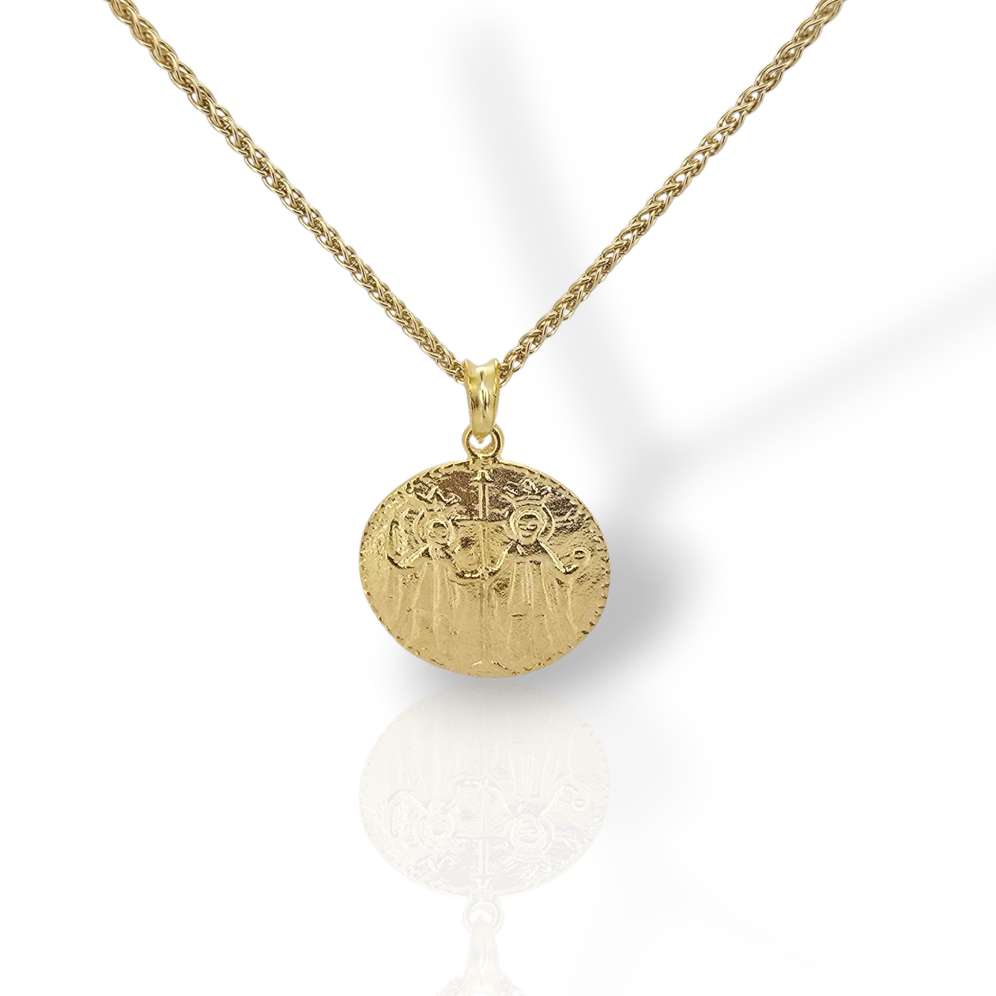 Ένα κλασικό και διαχρονικό κόσμημα με βαθιά παράδοση. Αυτό το χειροποίητο Κωνσταντινάτο είναι κατασκευασμένο από ασήμι 925 με επιχρύσωση, προσφέροντας την τέλεια ισορροπία μεταξύ πολυτέλειας και ανθεκτικότητας. Στη μία όψη απεικονίζονται οι Άγιοι Κωνσταντίνος και Ελένη, ενώ η πίσω όψη φέρει το παραδοσιακό "IC XC NI KA". Συνοδεύεται από κομψή επίχρυση αλυσίδα, αποτελώντας ένα ιδανικό δώρο φυλαχτό για εσάς ή τους αγαπημένους σας.