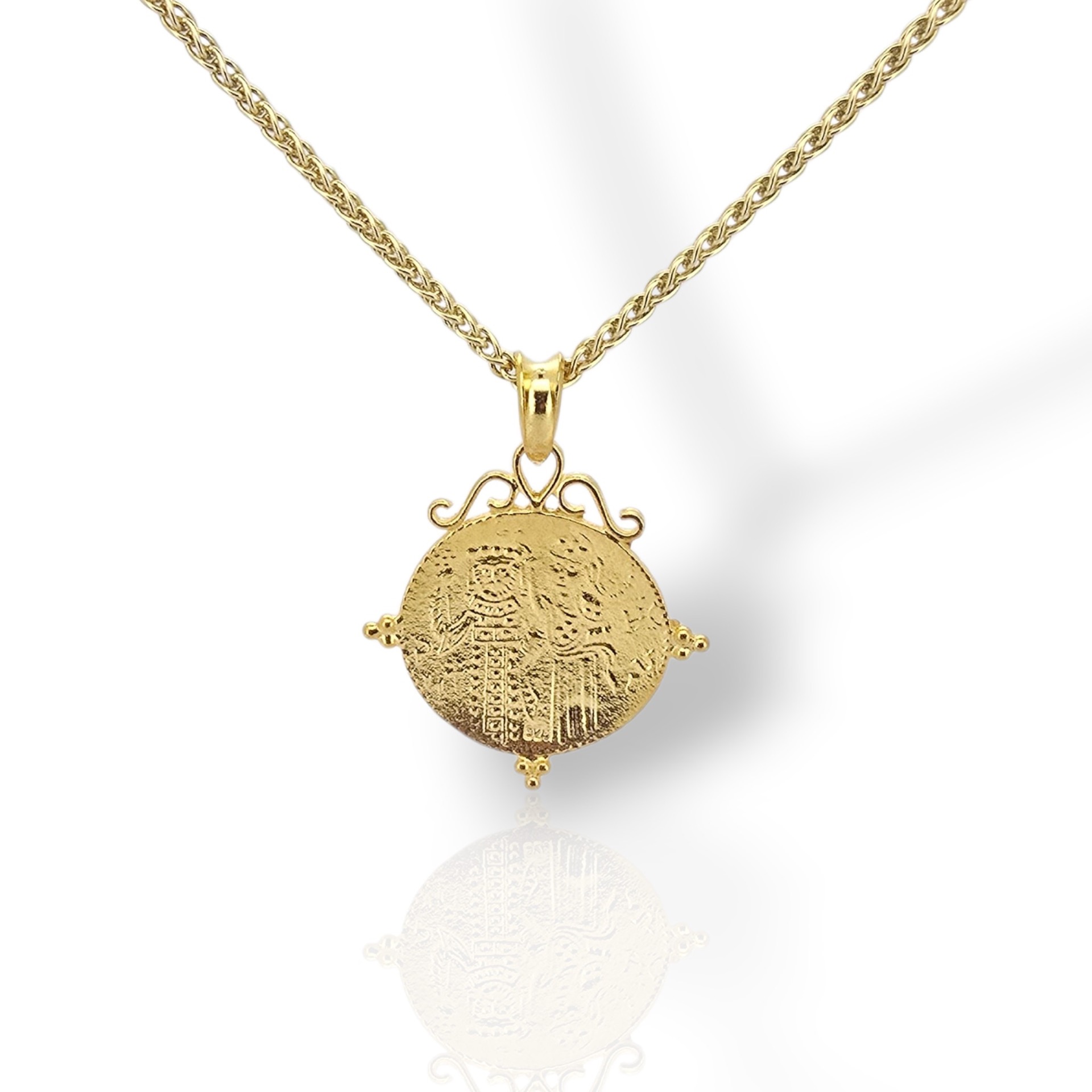 Ένα κλασικό και διαχρονικό κόσμημα με βαθιά παράδοση. Αυτό το χειροποίητο Κωνσταντινάτο είναι κατασκευασμένο από ασήμι 925 με επιχρύσωση, προσφέροντας την τέλεια ισορροπία μεταξύ πολυτέλειας και ανθεκτικότητας. Στη μία όψη απεικονίζονται οι Άγιοι Κωνσταντίνος και Ελένη, ενώ η πίσω όψη φέρει το παραδοσιακό "IC XC NI KA". Συνοδεύεται από κομψή επίχρυση αλυσίδα, αποτελώντας ένα ιδανικό δώρο φυλαχτό για εσάς ή τους αγαπημένους σας.