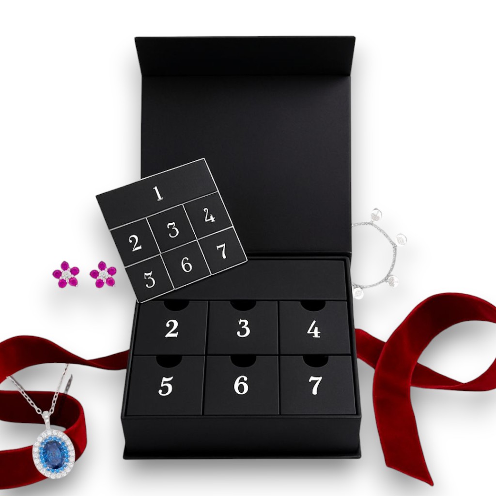 ✨ Ζήσε την εμπειρία της αναμονής με το πιο κομψό Advent Calendar της σεζόν. Μέσα στο πολυτελές μαύρο μαγνητικό κουτί κρύβονται 7 ξεχωριστές εκπλήξεις για να προσφέρουν στιγμές λάμψης. Ένα LIMITED EDITION δώρο, ιδανικό για γυναίκες 20+ που αγαπούν τη λάμψη της απλότητας και την ομορφιά του απροσδόκητου. Μέσα σε ένα από τα κουτιά του Advent Calendar κρύβεται μια δωροεπιταγή αξίας 50€ για τις επόμενες αγορές σας σε ασημένια κοσμήματα!