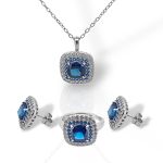 Σετ κοσμημάτων που αποτελείται απο δαχτυλίδι, κολιέ και σκουλαρίκια απο επιπλατινωμένο ασήμι 925º και λευκά ζιργκόν και συνθετικό μπλέ ζαφείρι 7mm x 7mm.