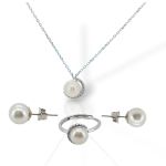 Σετ ασημένιων κοσμημάτων με πέρλα που αποτελείται απο δαχτυλίδι, κολιέ και σκουλαρίκια με λευκά ζιργκόν.