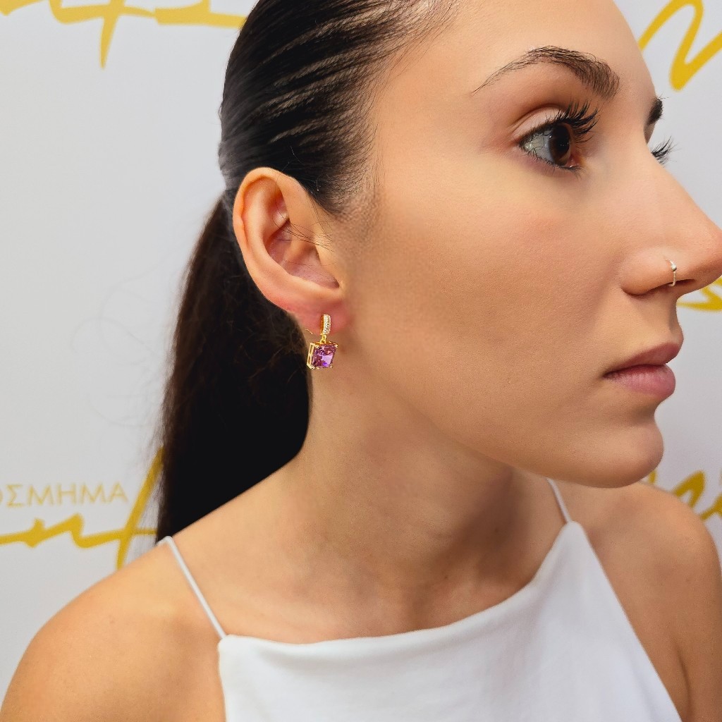 Ασημένια επιχρυσωμένα σκουλαρίκια με λευκά ζιργκόν και ροζ ζιργκόν 9.0mm x 7.0mm