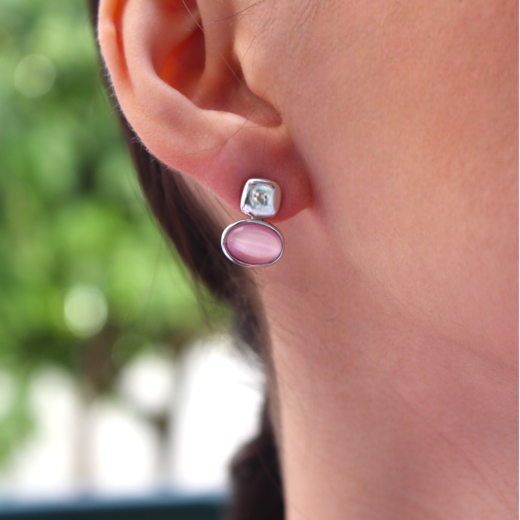 Κομψά σκουλαρίκια από επιπλατινωμένο ασήμι, διακοσμημένα με ροζ μάτι της γάτας. Ένα ρομαντικό και εκλεπτυσμένο κόσμημα που χαρίζει θηλυκότητα και κομψότητα σε κάθε εμφάνιση.