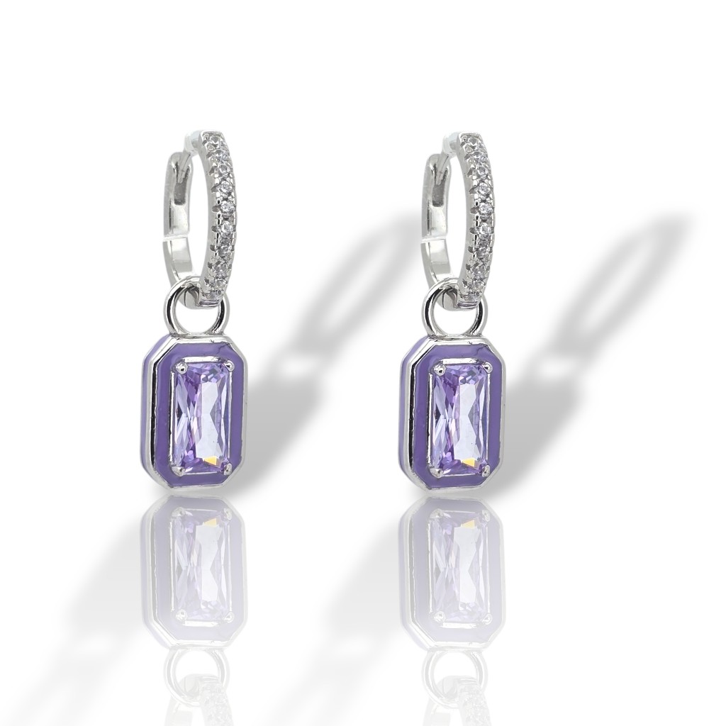 Ασημένια σκουλαρίκια κρίκοι με λευκά ζιργκόν , επιπλατινωμένα με συνθετικό αμέθυστο και μωβ σμάλτο.