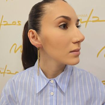 Ασημένια σκουλαρίκια επιχρυσωμένα κρεμαστά με πολλαπλές ασύμμετρες αλυσίδες , διακοσμημένες με μικρά ορθογώνια σχήματα.