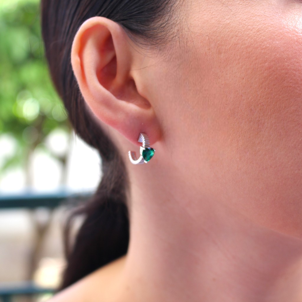 Ασημένια σκουλαρίκια επιπλατινωμένα, που καταλήγουν σε καρφωτό κούμπωμα με πράσινη καρδιά.