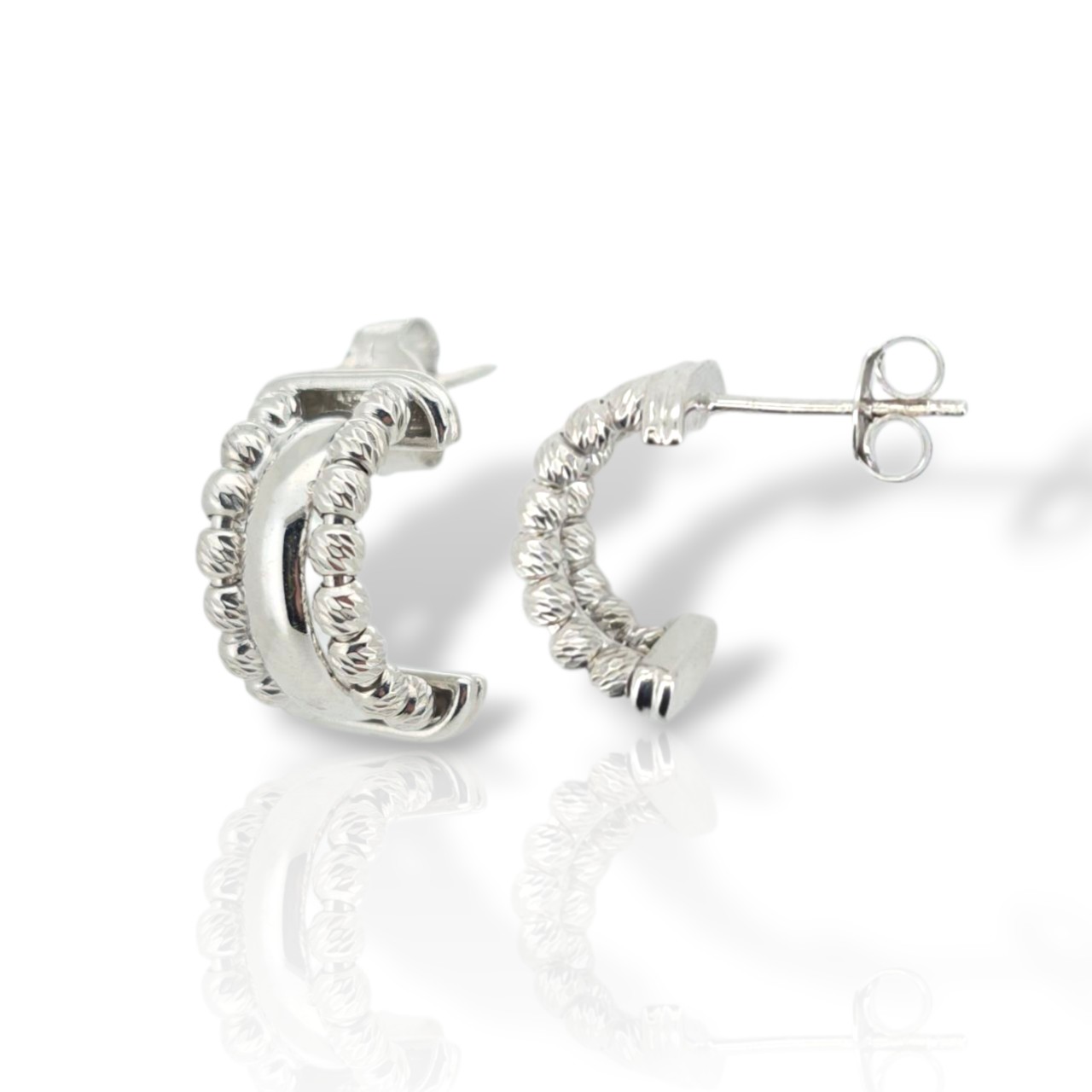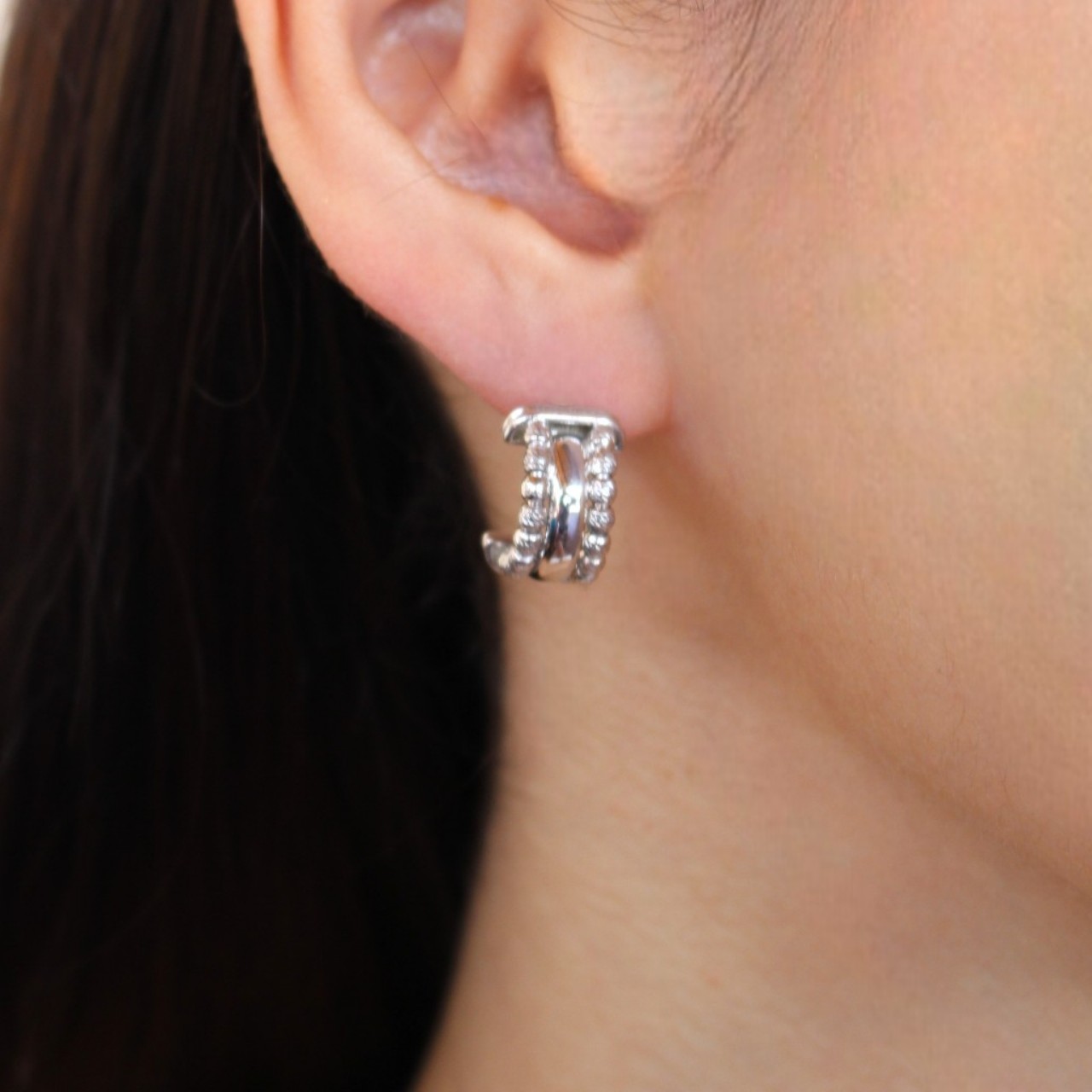 Ασημένια σκουλαρίκια επιπλατινωμένα με πολλαπλά κρικάκια ,ανάγλυφων και μη, που καταλήγουν σε καρφωτό κούμπωμα.