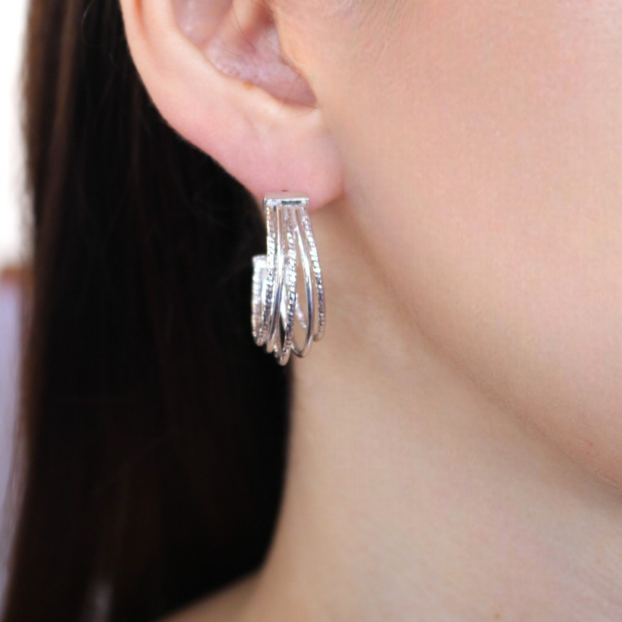 Ασημένια σκουλαρίκια με πολλαπλά κρικάκια ,ανάγλυφων και μη, που καταλήγουν σε καρφωτό κούμπωμα.