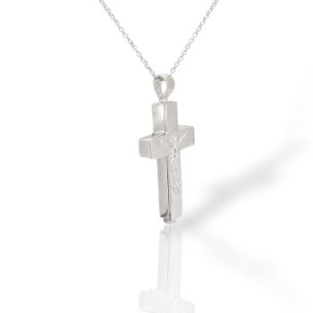 Χειροποίητος σταυρός από ασήμι με επικάλυψη πλατίνας. Διαθέτει εσωτερικό άνοιγμα για την τοποθέτηση Τιμίου Ξύλου ή βαμβακιού με λάδι (μύρο), συνδυάζοντας την πίστη με την υψηλή αισθητική.