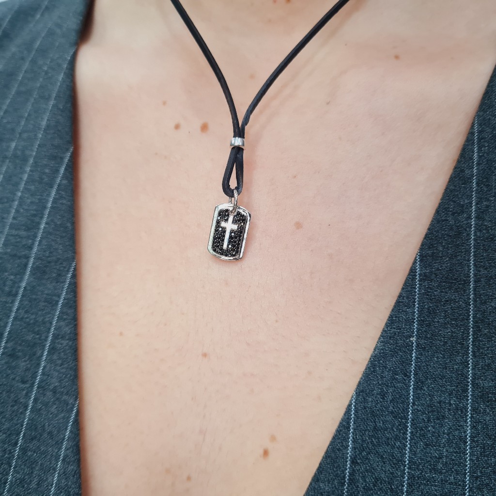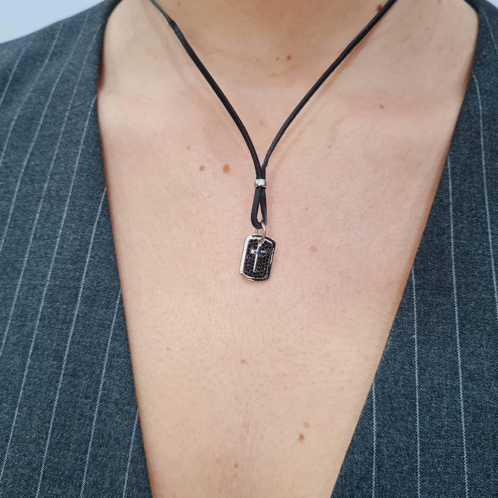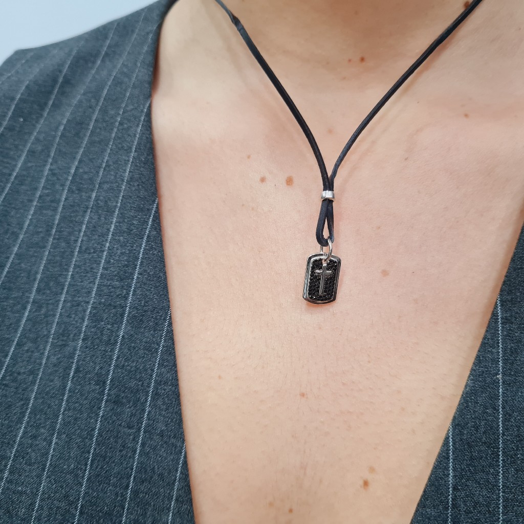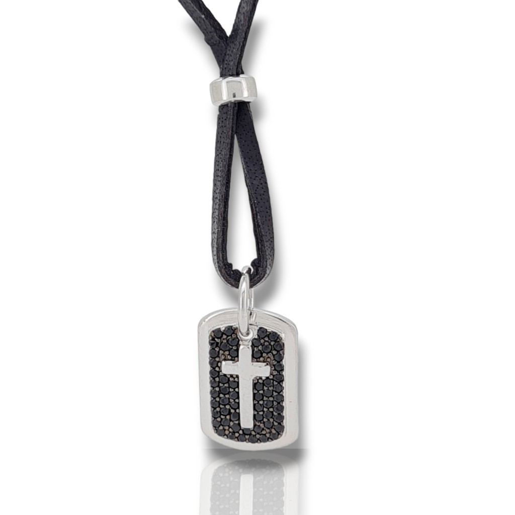 Ρυθμιζόμενο κολιέ από βαμβακερό σχοινί με Σταυρό επιπλατινωμένο και μαύρα ζιργκόν