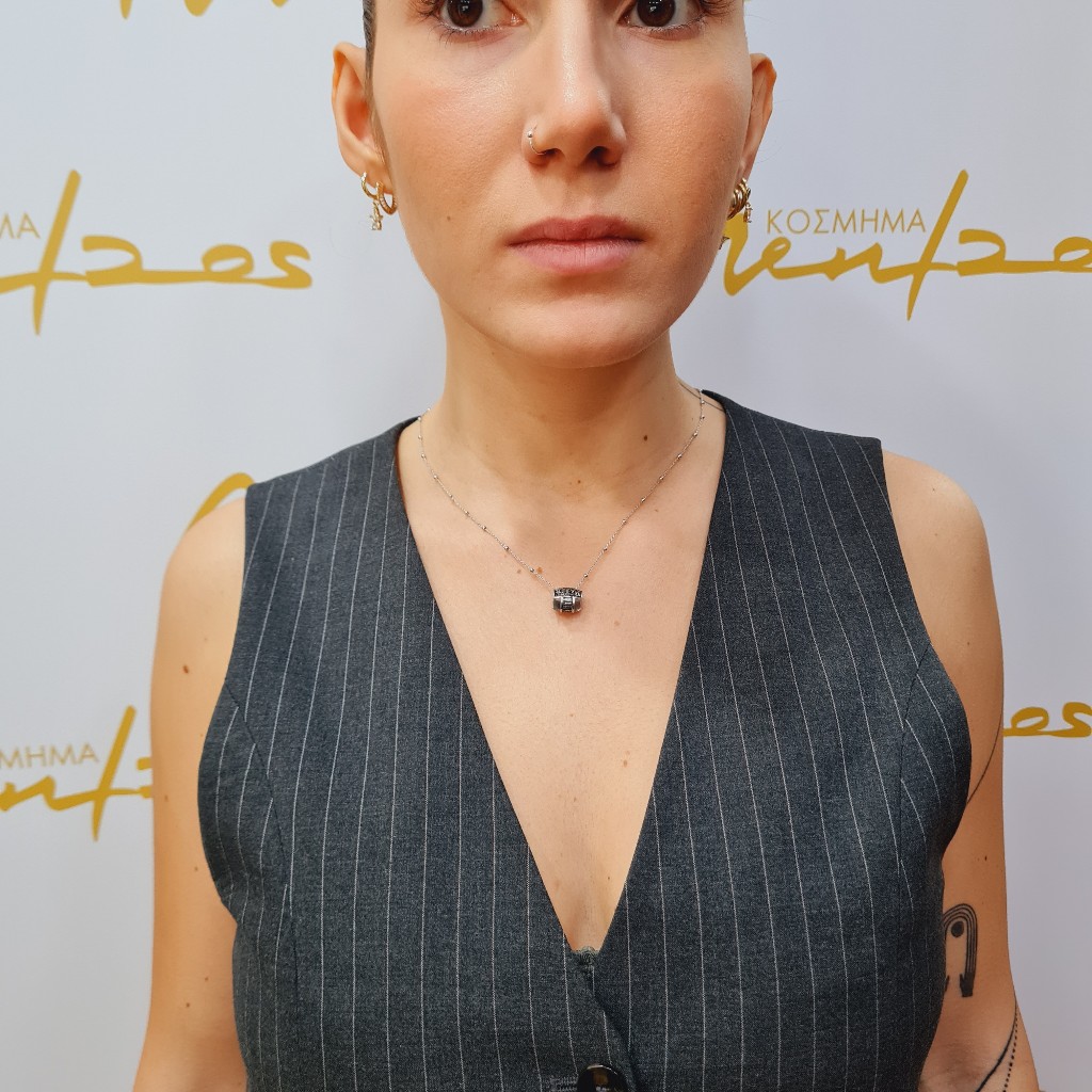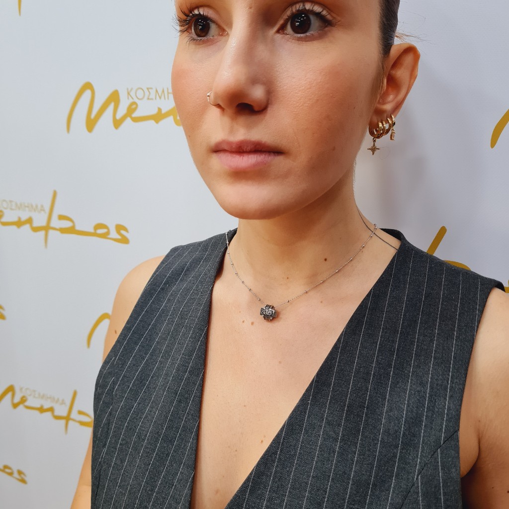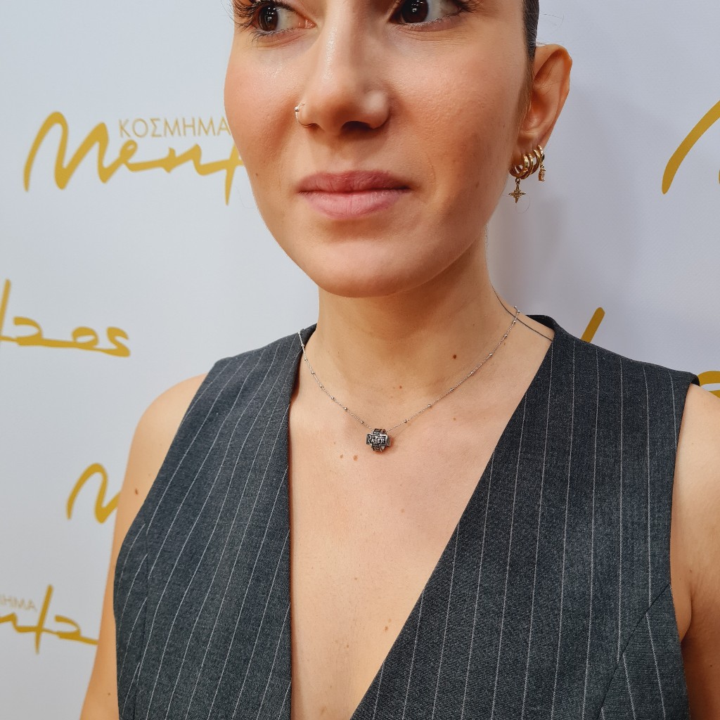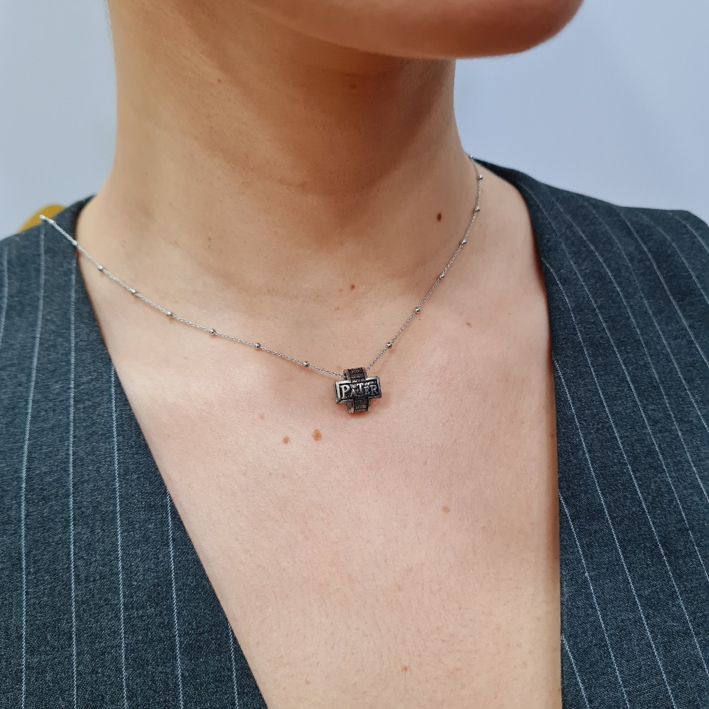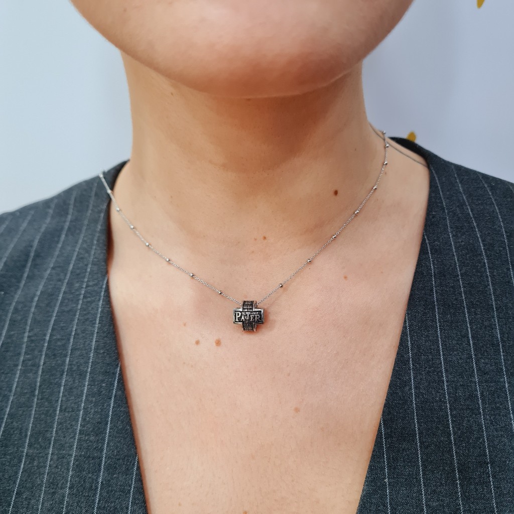 Κολιέ από ασήμι 925, Κατασκευάσμένο στην Ιταλία και με τη φράση «pater noster, qui es in cælis, sanctificétur nomen tuum, advéniat regnum tuum, fiat volúntas tua, sicut in cælo, et in terra. panem nostrum cotidiánum da nobis hódie, et dimítte nobis débita nostra, sicut et nos dimíttimus debitóribus nostris. et ne nos indúcas in tentatiónem,sed líbera nos a malo. » Μήκος κολιέ 45 εκ