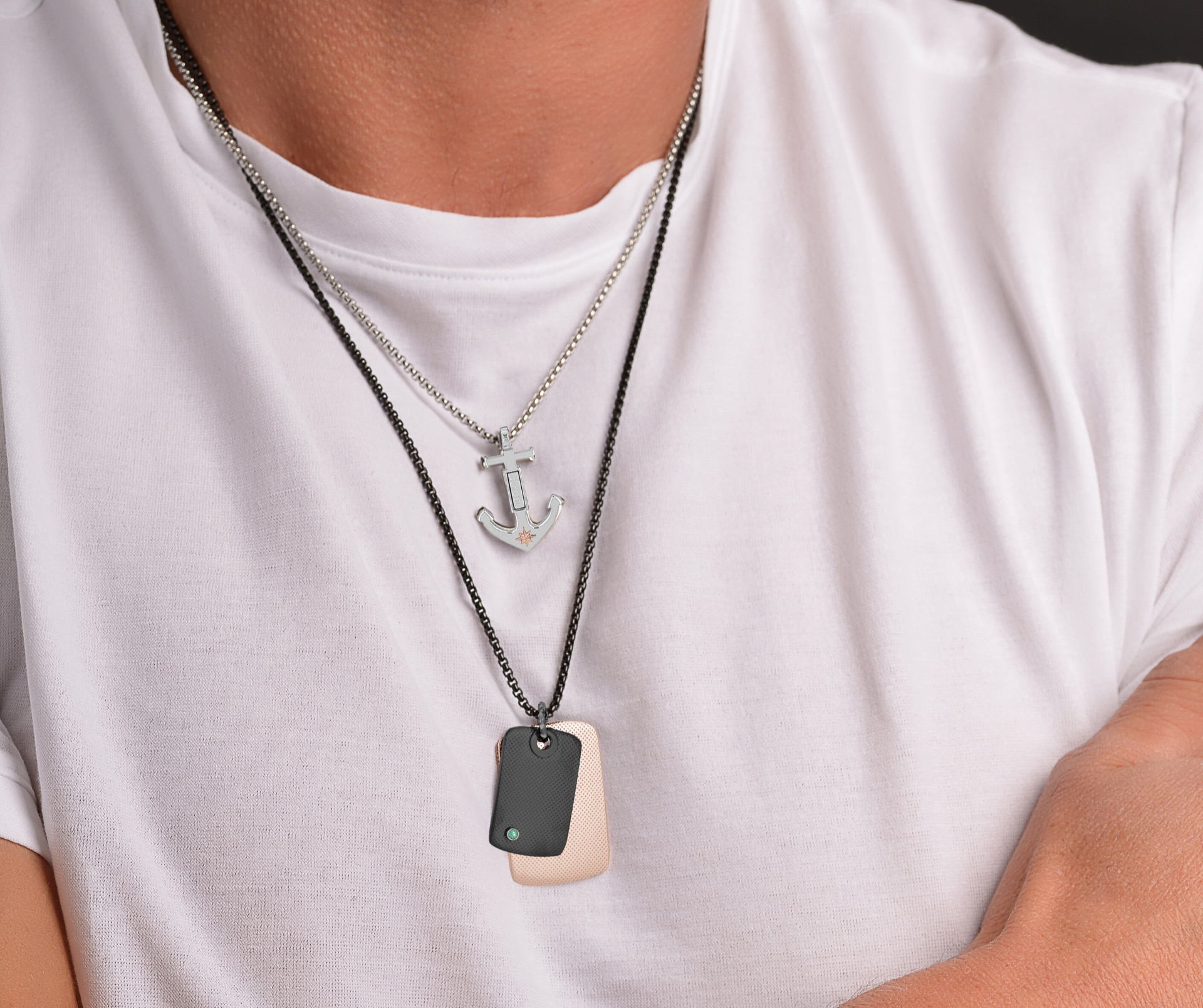 Κολιέ με μενταγιόν πλάκα με ραβδωτό (godronato) φινίρισμα σε μαύρο PVD και αστέρι του Βορρά σε ροζ χρυσό.