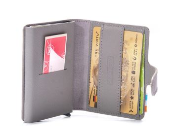 Πολύ πρακτικό και κομψό, αυτό το πορτοφόλι συνδυάζει λειτουργικότητα και σύγχρονο σχεδιασμό. Διαθέτει ενσωματωμένο αλουμινένιο μηχανισμό με χωρητικότητα έως 6 κάρτες, εξοπλισμένο με σύστημα γρήγορης αποδέσμευσης, που επιτρέπει την άμεση και εύκολη πρόσβαση στις πιστωτικές κάρτες μέσω του κάτω μοχλού. Παράλληλα, προσφέρει επιπλέον χώρο με 2–3 θήκες για κάρτες, καθώς και υποδοχές για μικρά έγγραφα, αποδείξεις ή εισιτήρια, τα οποία τοποθετούνται με ασφάλεια στην ειδική τους τσέπη. Συνιστάται για συνολικά έως 9 κάρτες (αλουμινένιος μηχανισμός: μέγιστο 6–7 κάρτες). Κατασκευασμένο από γνήσιο δέρμα Saffiano, γνωστό για την κομψή όψη και την υψηλή αντοχή του, αποτελεί ιδανική επιλογή για καθημερινή χρήση με στυλ.