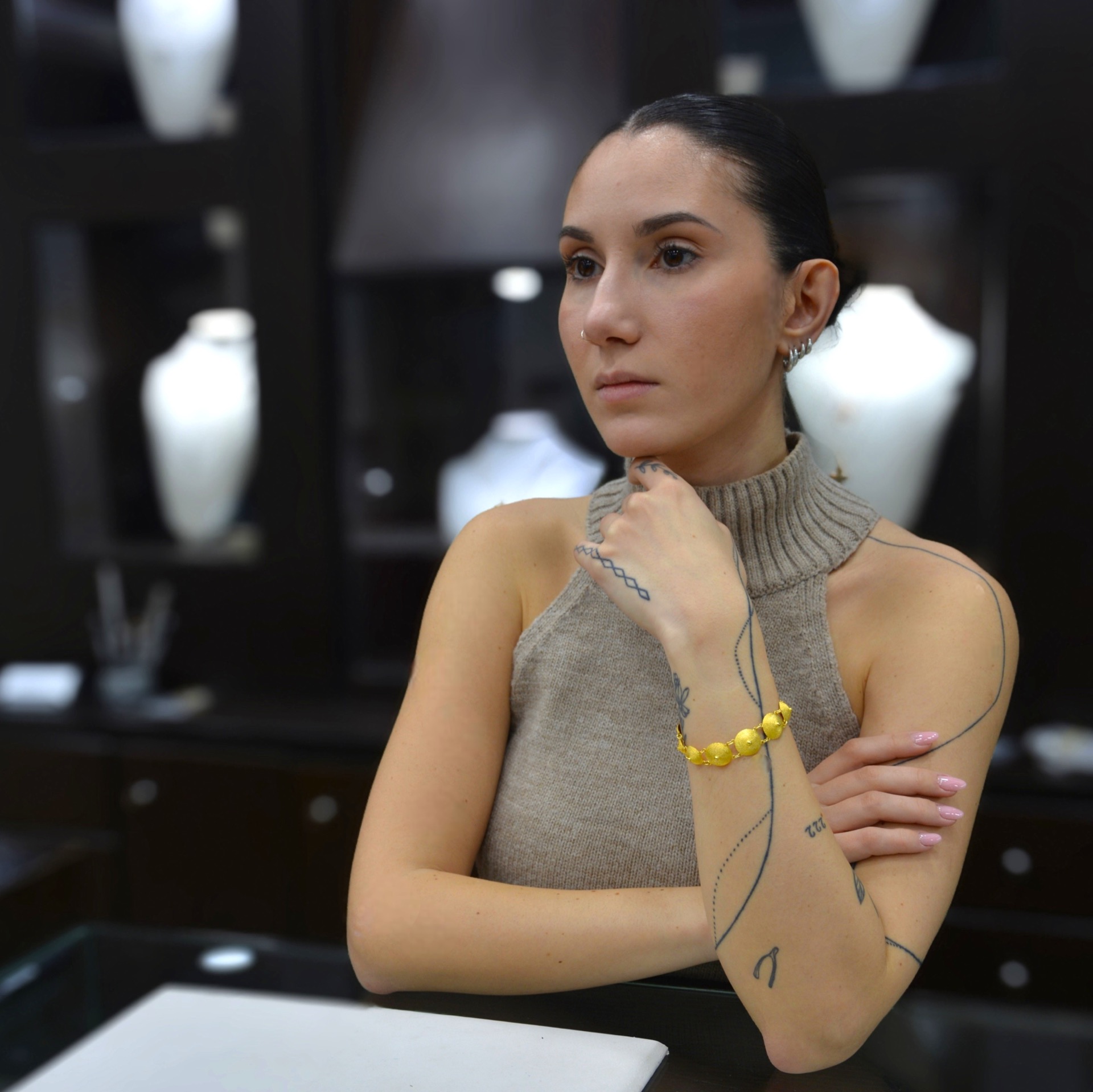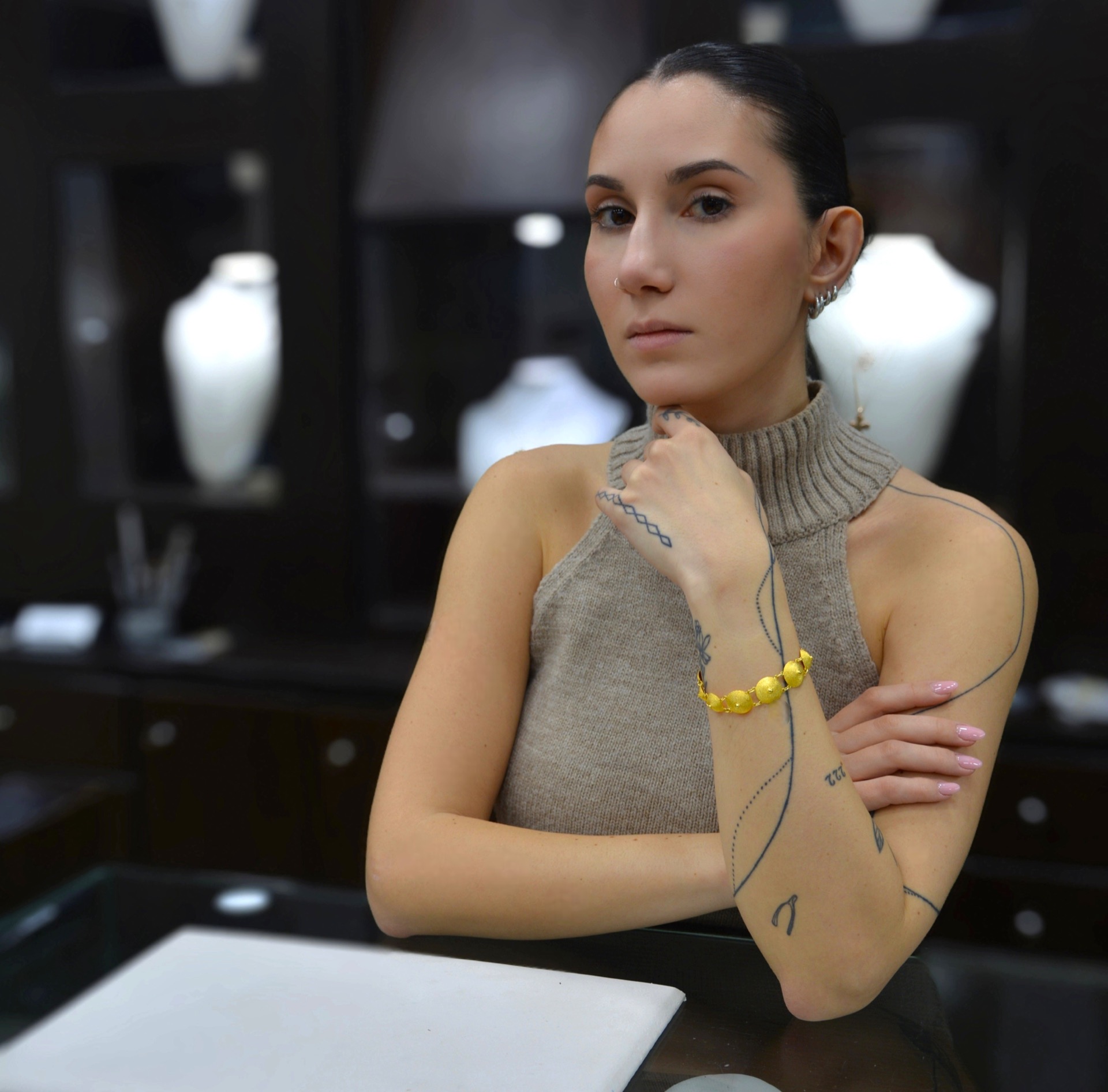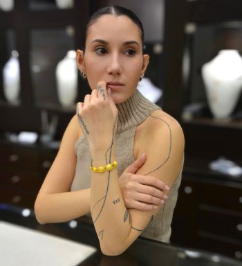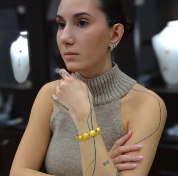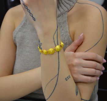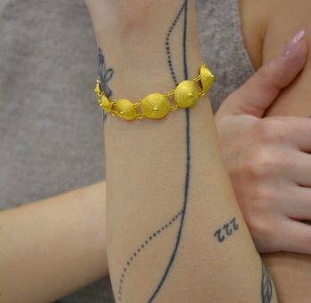 Ένα κομψό και διαχρονικό κόσμημα που αποπνέει πολυτέλεια. Το βραχιόλι αυτό αποτελείται από σειρά χρυσών στρογγυλών στοιχείων με ανάγλυφη υφή, που ενώνονται με λεπτούς κρίκους, δημιουργώντας ένα φίνο και ευέλικτο σχέδιο. Η λαμπερή του απόχρωση και η ιδιαίτερη υφή του προσδίδουν μοναδική αίγλη και το καθιστούν ιδανική επιλογή για κάθε περίσταση