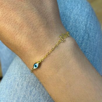 Χρυσό βραχιόλι με ποδηλατάκι και μπλε ματάκι