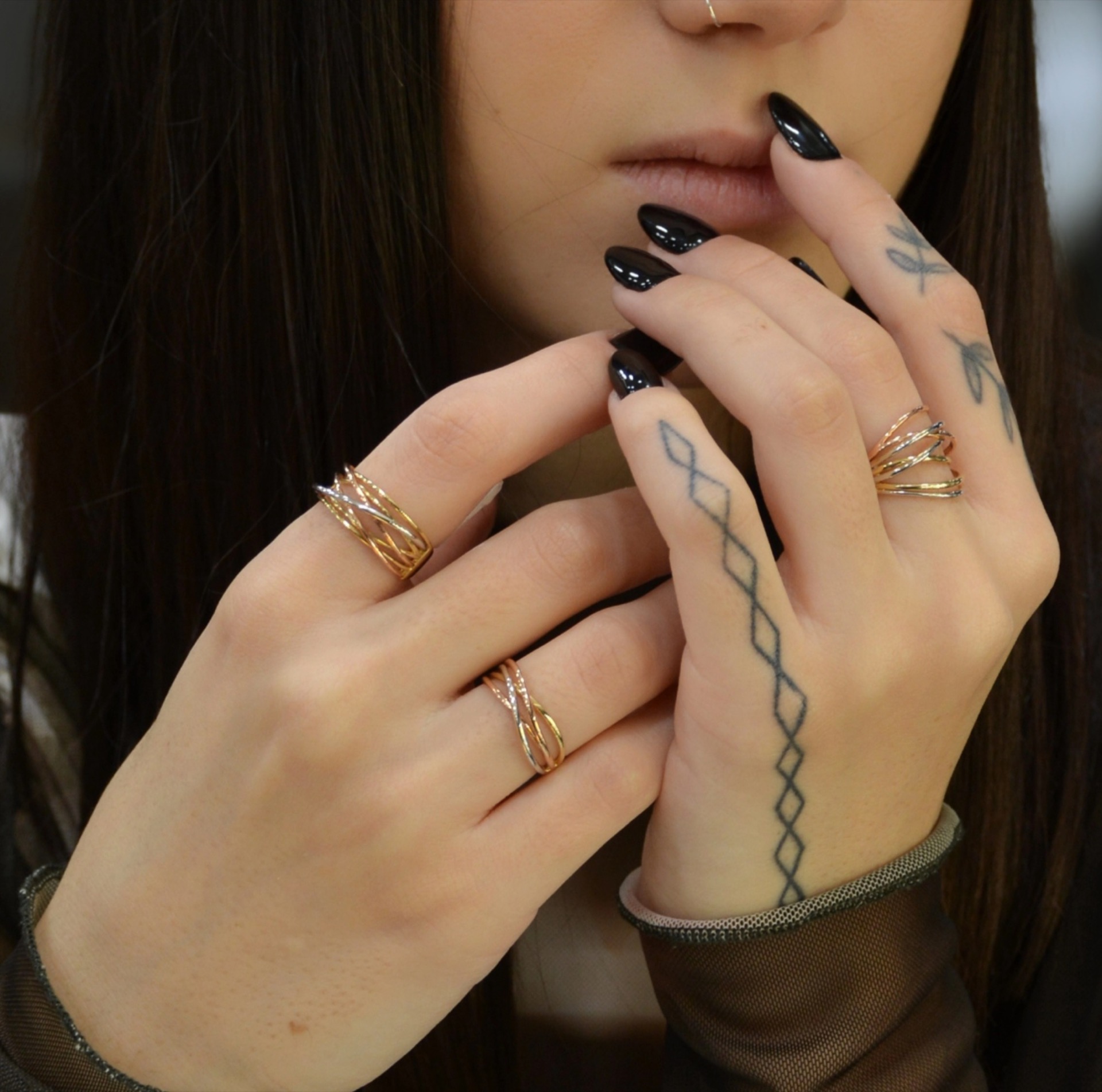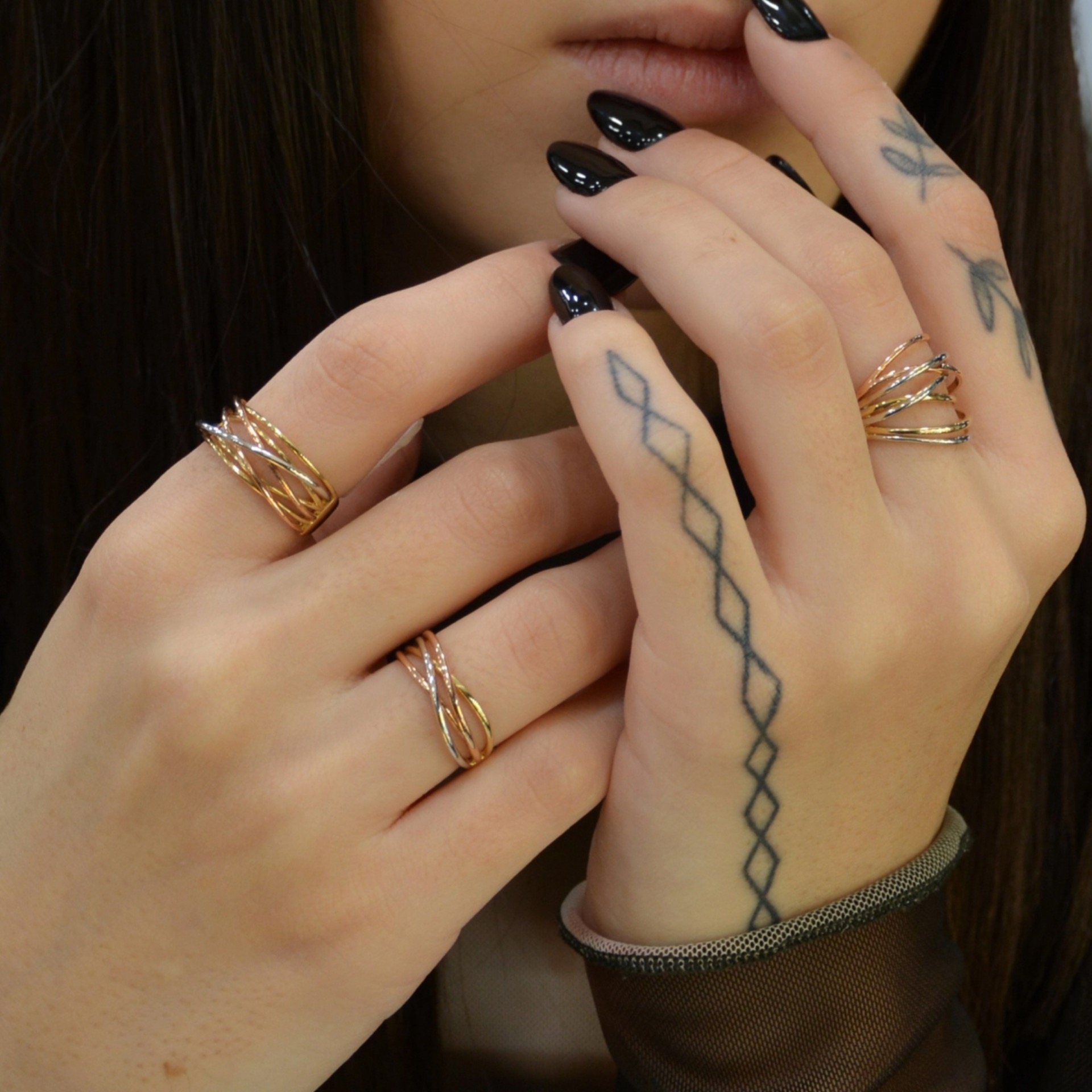 Χειροποίητο δαχτυλίδι κατασκευασμένο απο χρυσό δεκατεσσάρων καρατίων με τα τρία χρώματα. Κίτρινο, λευκό και ροζ με λουστράτες επιφάνειες.