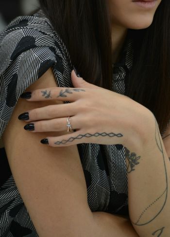 Στο κέντρο δεσπόζει ένα διαμάντι 0.43 καρατίων, princess cut, κορυφαίας ποιότητας, με πιστοποίηση GIA, καθαρότητα VVS1, χρώμα D και κοπή Excellent, που εξασφαλίζει ασυναγώνιστη λάμψη και φωτεινότητα