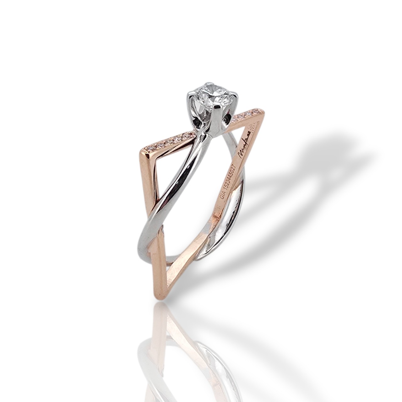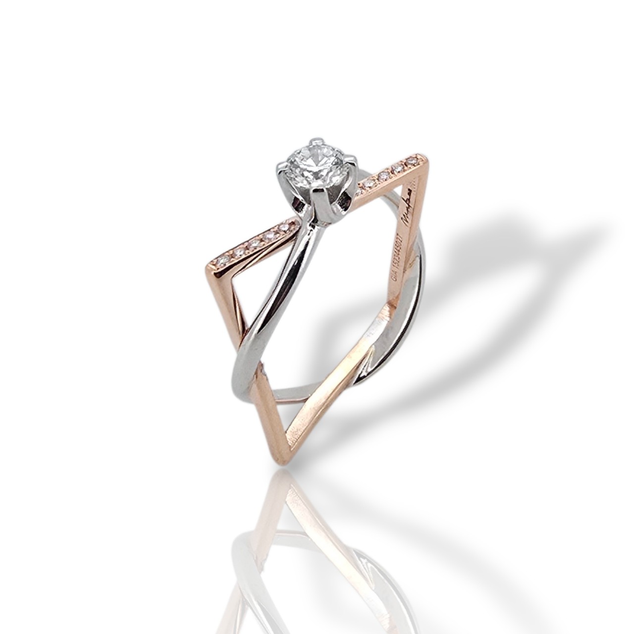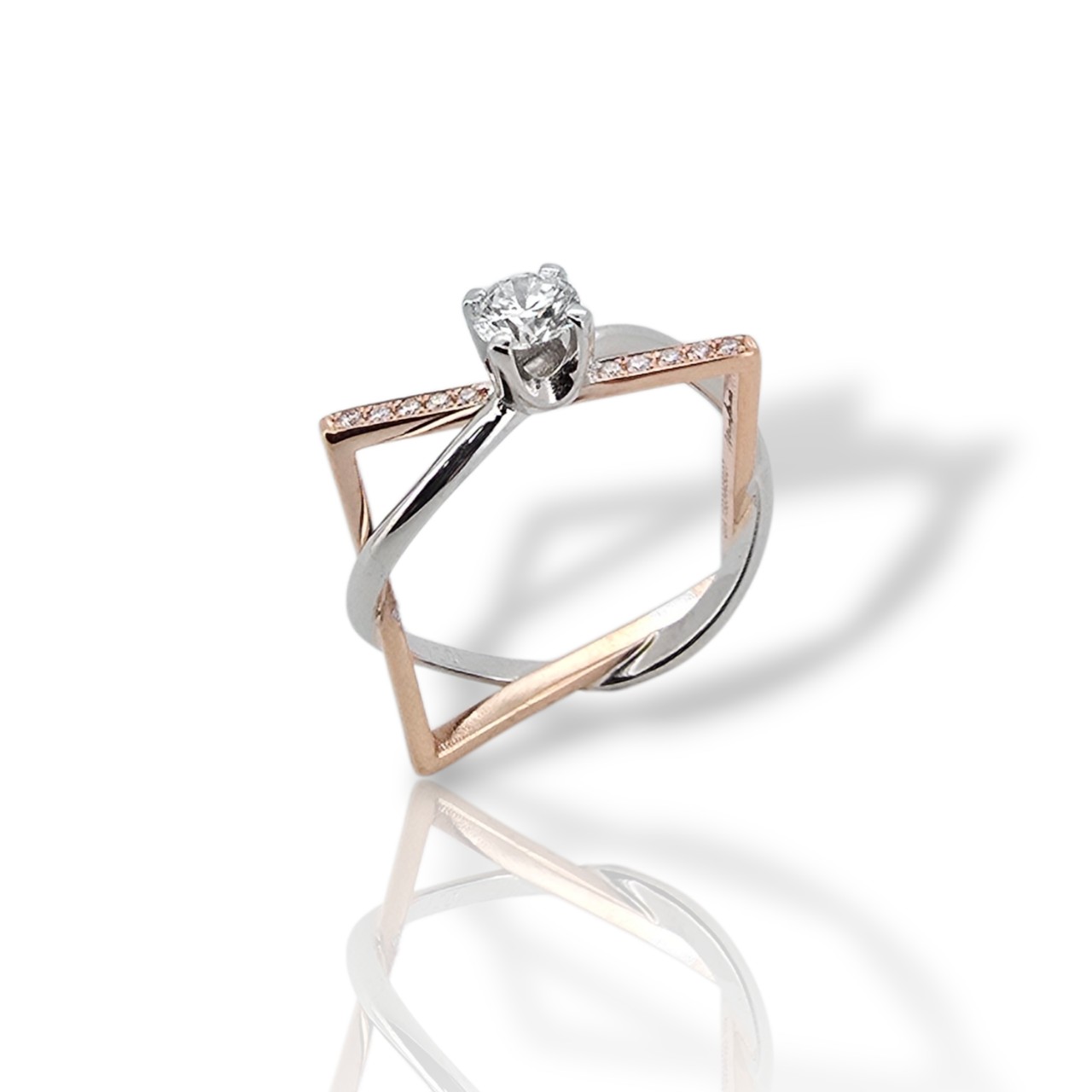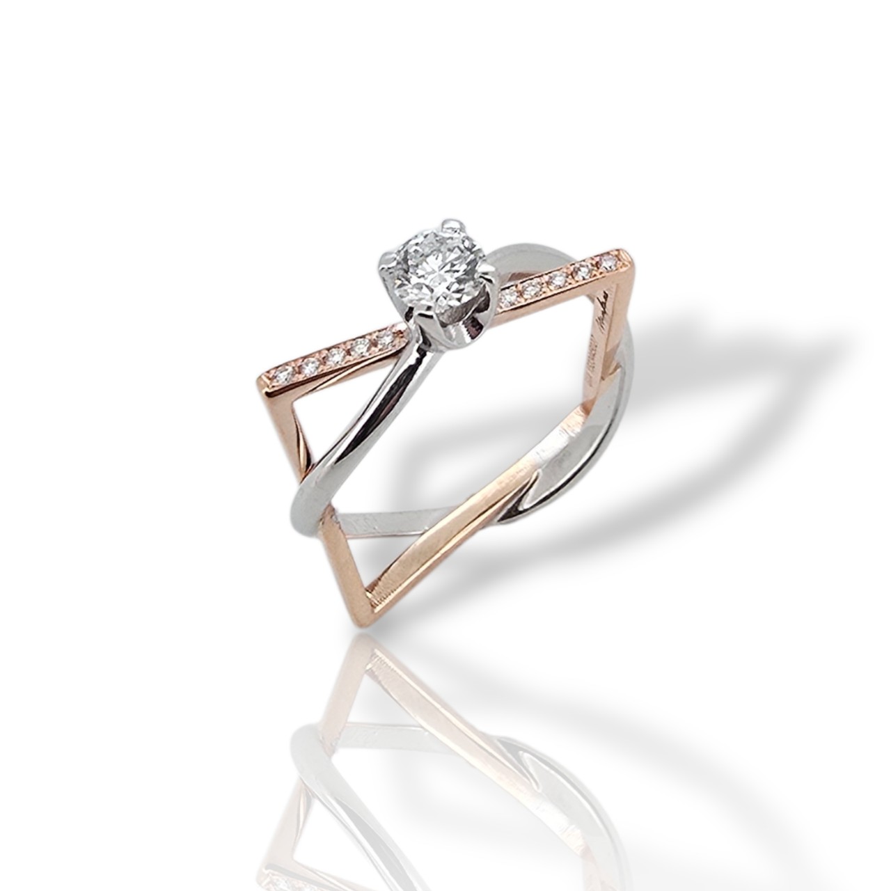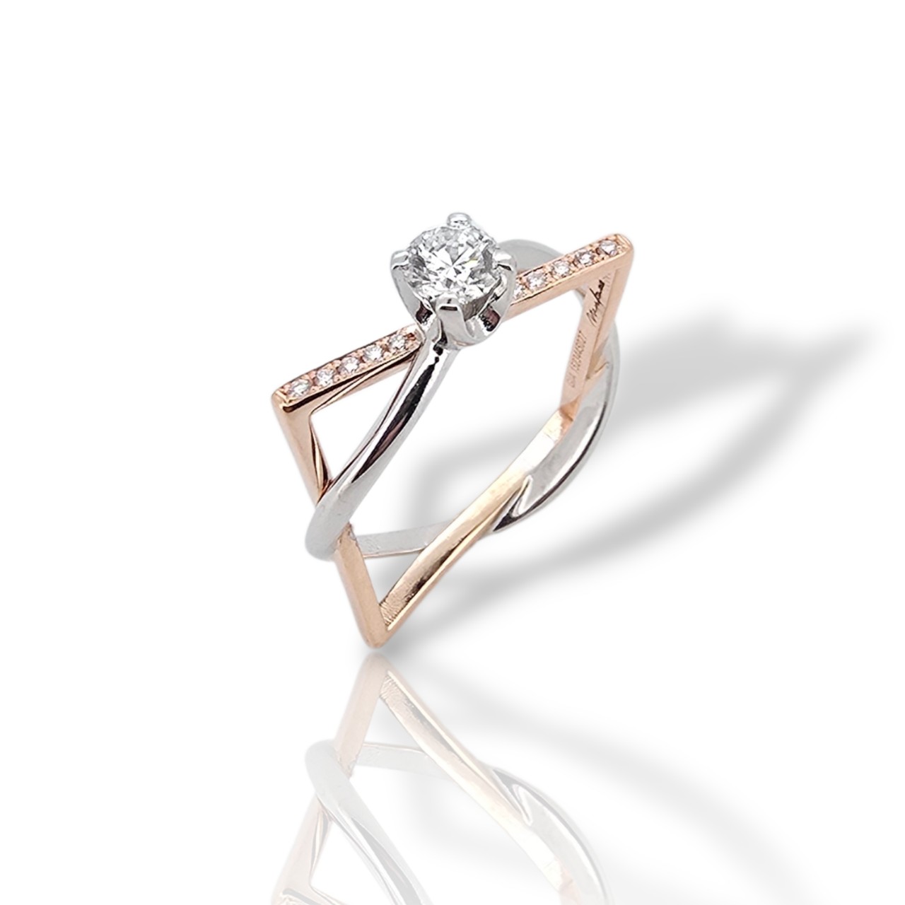 Το δαχτυλίδι Eclipse είναι ένα εντυπωσιακό μονόπετρο που συνδυάζει ροζ και λευκό χρυσό σε έναν μοντέρνο γεωμετρικό σχεδιασμό. Στο κέντρο του δεσπόζει ένα διαμάντι 0.40ct, ποιότητας VVS1 D με πιστοποίηση GIA, κοπής 3EX, που χαρίζει εκτυφλωτική λάμψη και διαχρονική κομψότητα. Ένα δαχτυλίδι που ενώνει τη σύγχρονη αισθητική με την αιώνια υπόσχεση αγάπης.