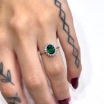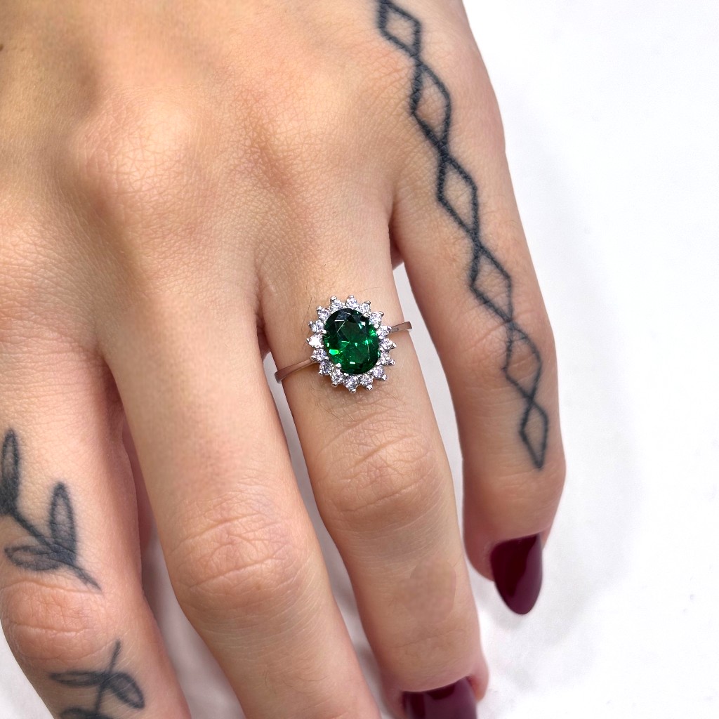 Ένα κομψό δαχτυλίδι ροζέτα από λευκόχρυσο 9 καρατίων, διακοσμημένο με λαμπερό συνθετικό σμαράγδι που προσφέρει βαθύ πράσινο χρώμα και εκλεπτυσμένη πολυτέλεια. Μια διαχρονική επιλογή που συνδυάζει κλασικό ύφος και σύγχρονη κομψότητα.