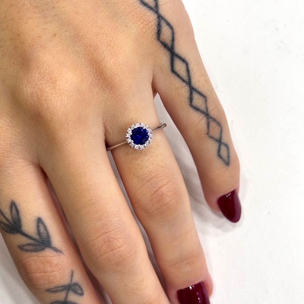 Ένα κομψό δαχτυλίδι ροζέτα από λευκόχρυσο 9 καρατίων, στολισμένο με εντυπωσιακό συνθετικό ζαφείρι που χαρίζει διαχρονική λάμψη και χρώμα. Ο ιδανικός συνδυασμός κλασικής αισθητικής και μοντέρνας κομψότητας για κάθε περίσταση.
