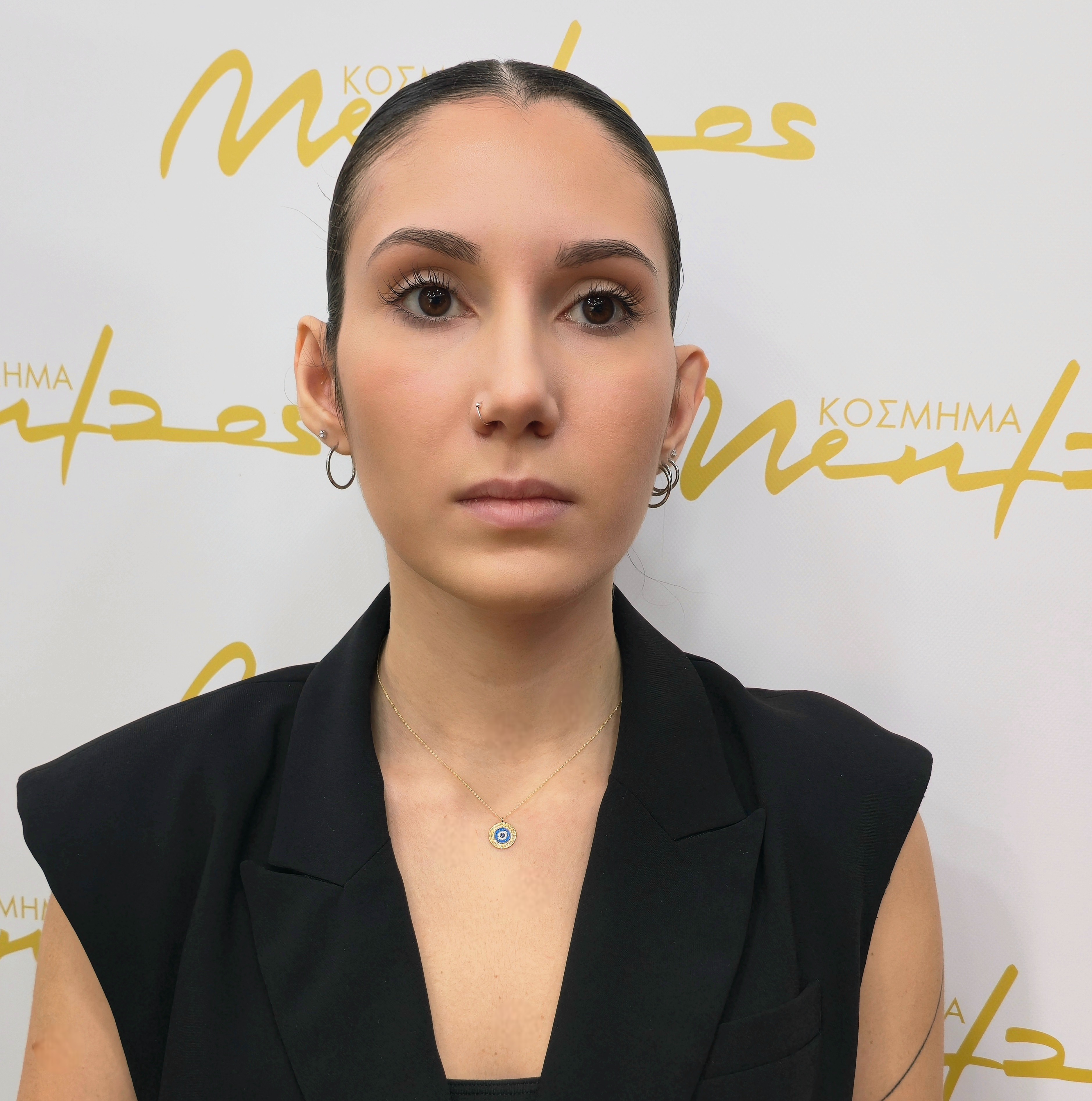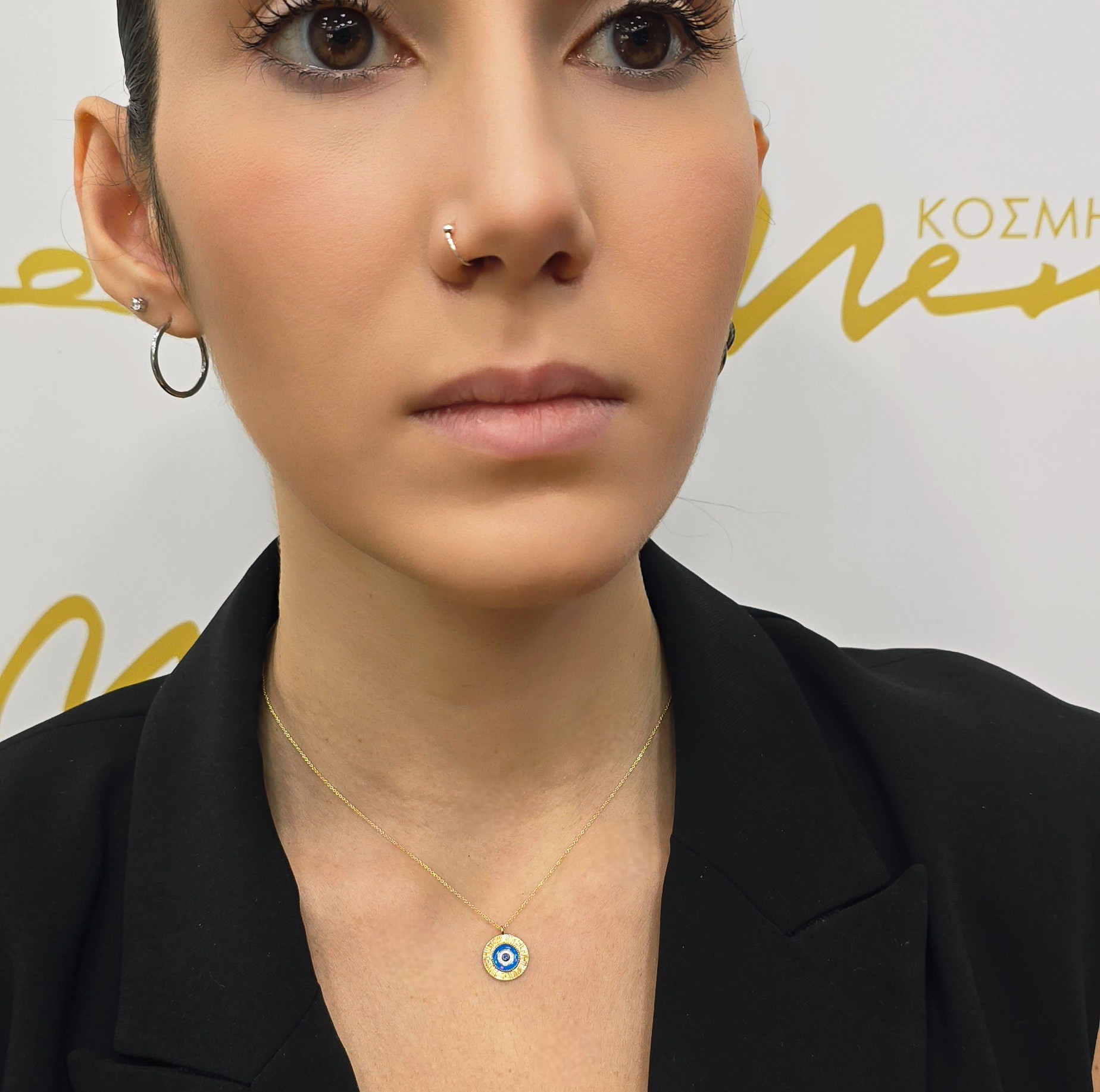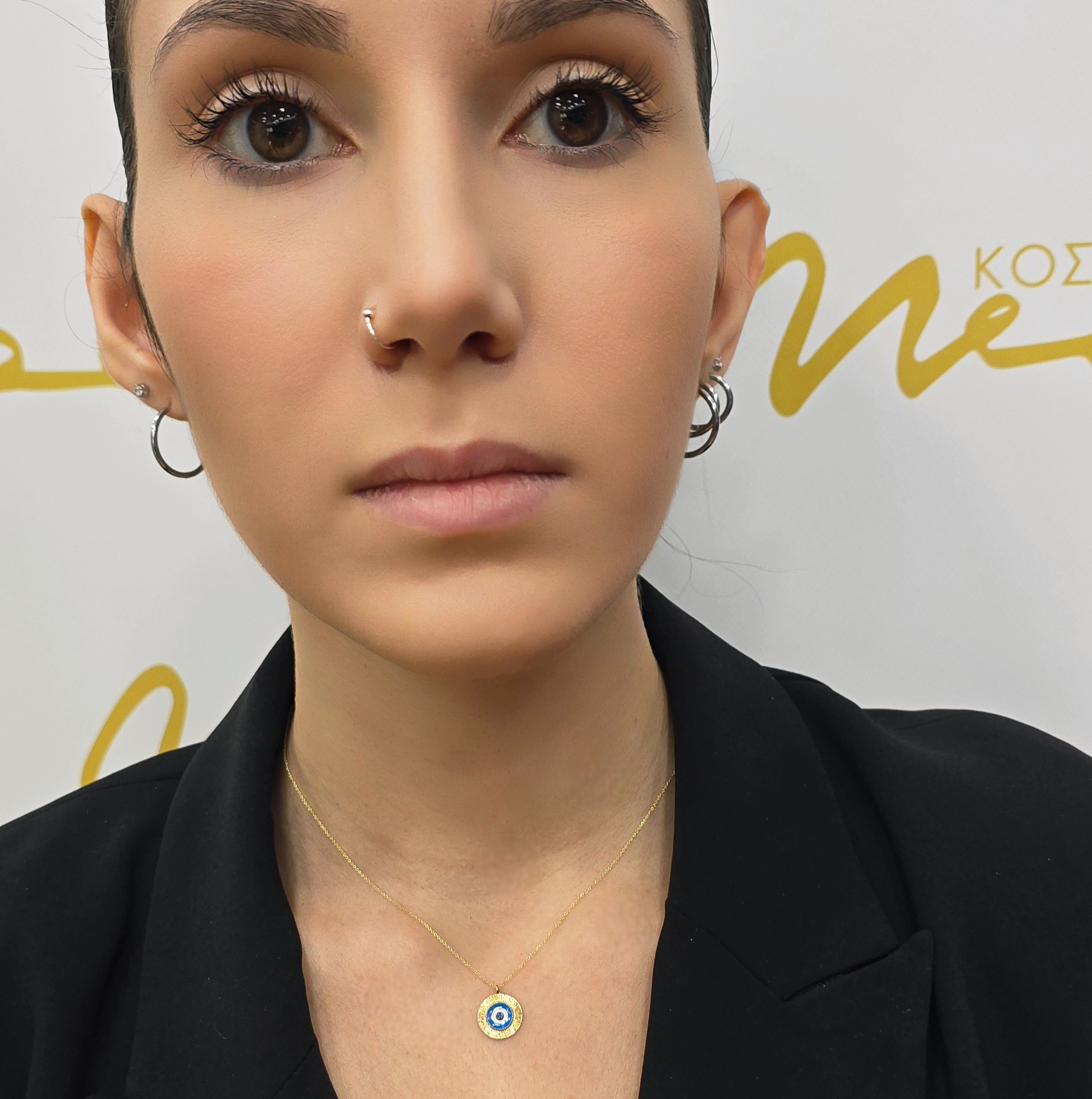 Ένα κομψό χρυσό κολιέ με μενταγιόν σε σχήμα ματιού και ιδιαίτερο εφέ ψάθας. Στο κέντρο του δεσπόζει ένα λαμπερό ζαφείρι 0.010ct, προσφέροντας διακριτική λάμψη και πολυτέλεια. Ιδανικό για καθημερινή κομψότητα ή ως ένα δώρο με νόημα.