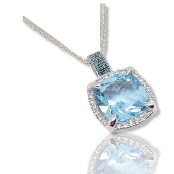Κολιέ απο λευκό χρυσό 18 καρατίων με πέτρα μπλε τοπαζ 3,61ct και διαμάντια brilliant λευκά περιμετρικά και μπλε στον κρίκο 0,17ct. Στην τιμή συμπεριλαμβάνεται η διπλή αλυσίδα 45cm