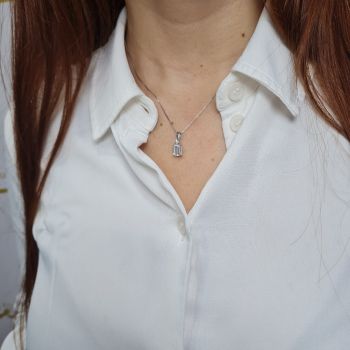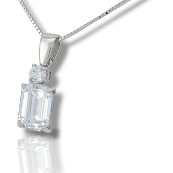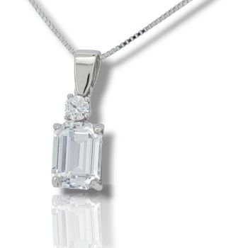 Λευκόχρυσο μενταγιόν με την κεντρική πέτρα καρέ λευκό ζιργκόν και μικρά στρογγυλά λευκά ζιργκόν. Στην τιμη συμπεριλαμβάνεται η αλυσίδα Κ14, 45cm