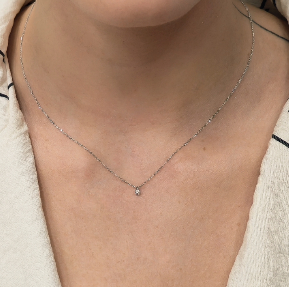 Μενταγιόν μονόπετρο με μπριγιάν G SI ct 0.030. Στην τιμη συμπεριλαμβάνεται η αλυσίδα 45cm