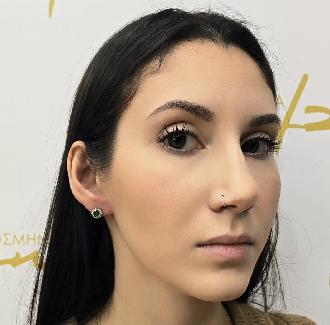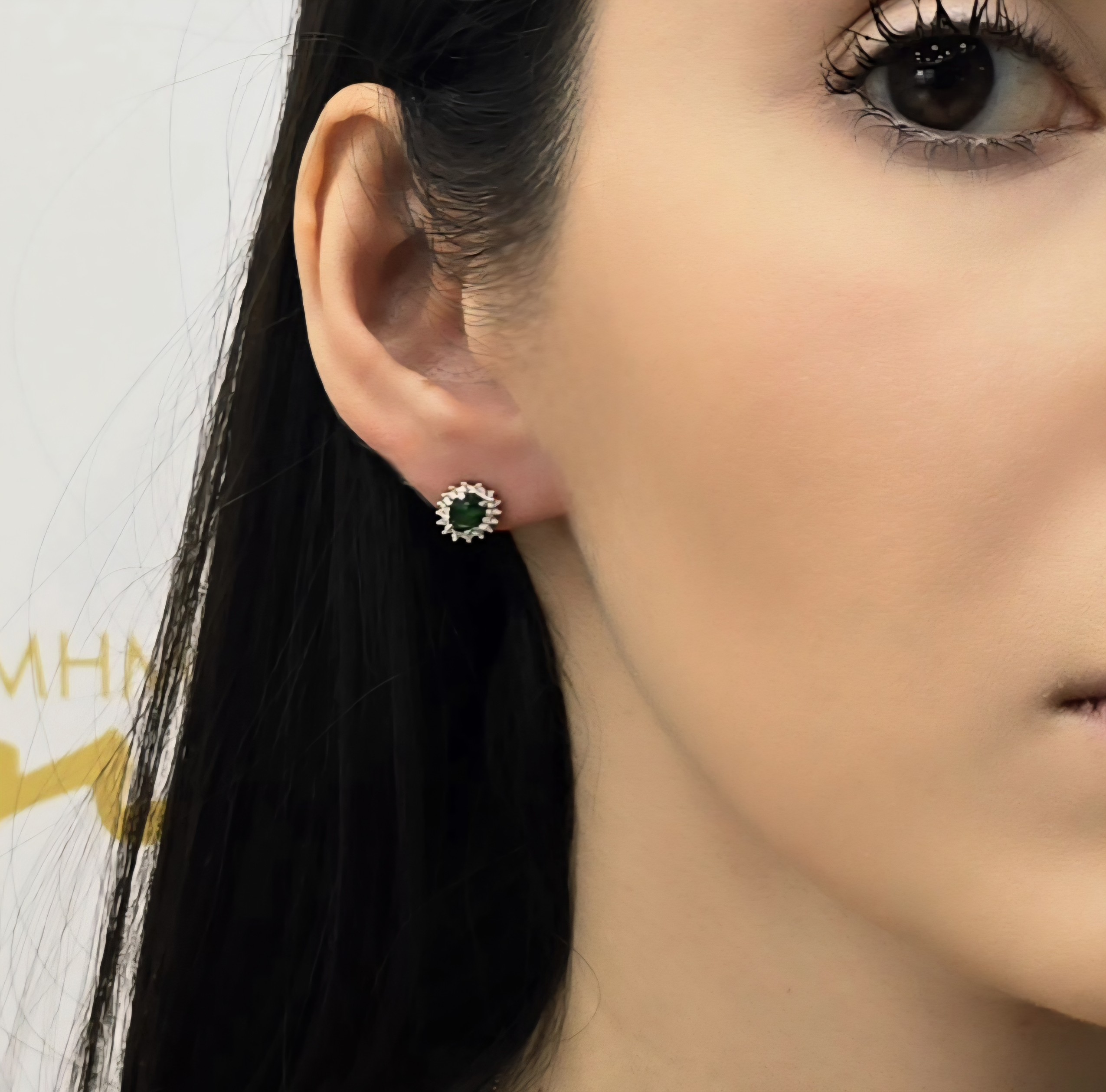Λευκόχρυσα σκουλαρίκια Κ9 σε σχέδιο ροζέτας, διακοσμημένα με ένα εντυπωσιακό συνθετικό σμαράγδι σε οβάλ κοπή στο κέντρο. Γύρω του αγκαλιάζουν λαμπερά λευκά ζιργκόν, προσδίδοντας διαχρονική κομψότητα και μοναδική λάμψη. Ένα ζευγάρι σκουλαρίκια που συνδυάζει κλασικό στυλ και σύγχρονη φινέτσα, ιδανικό για καθημερινή αλλά και βραδινή εμφάνιση.