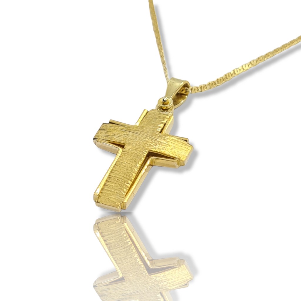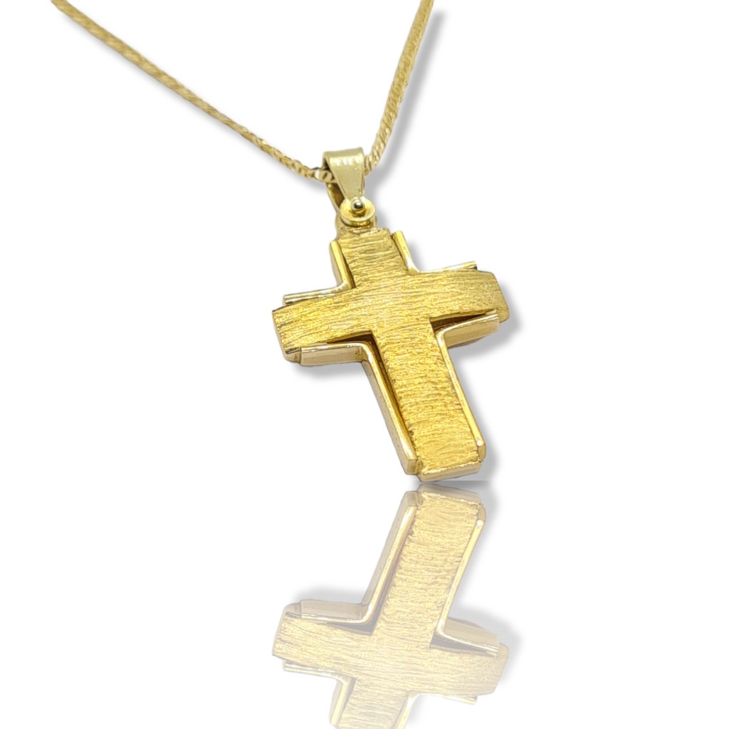 Σταυρός απο χρυσό K14 με την μια όψη σαγρέ ματ & την άλλη λουστρέ. Στην τιμή συμπεριλαμβάνεται η αλυσίδα κ14, 45cm.