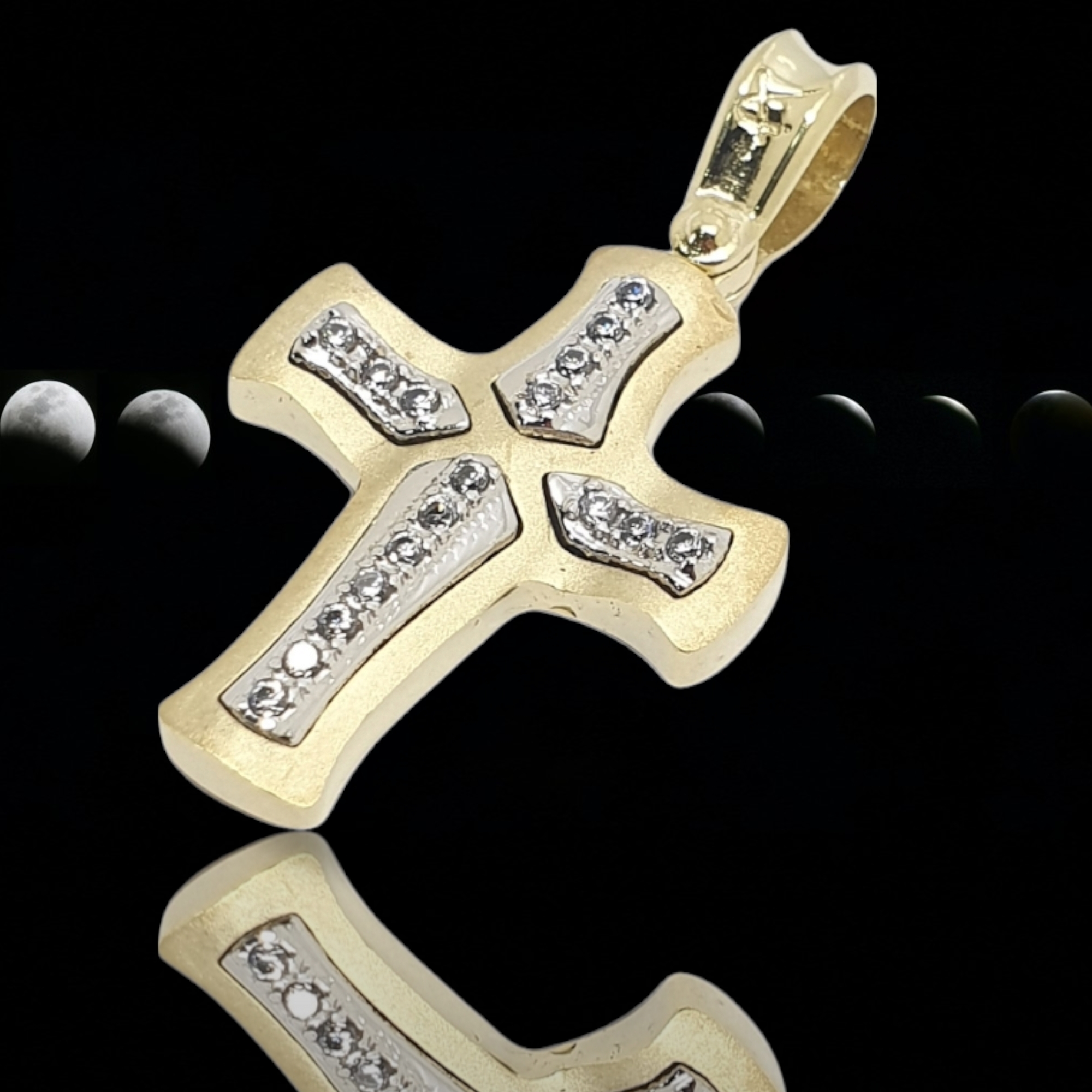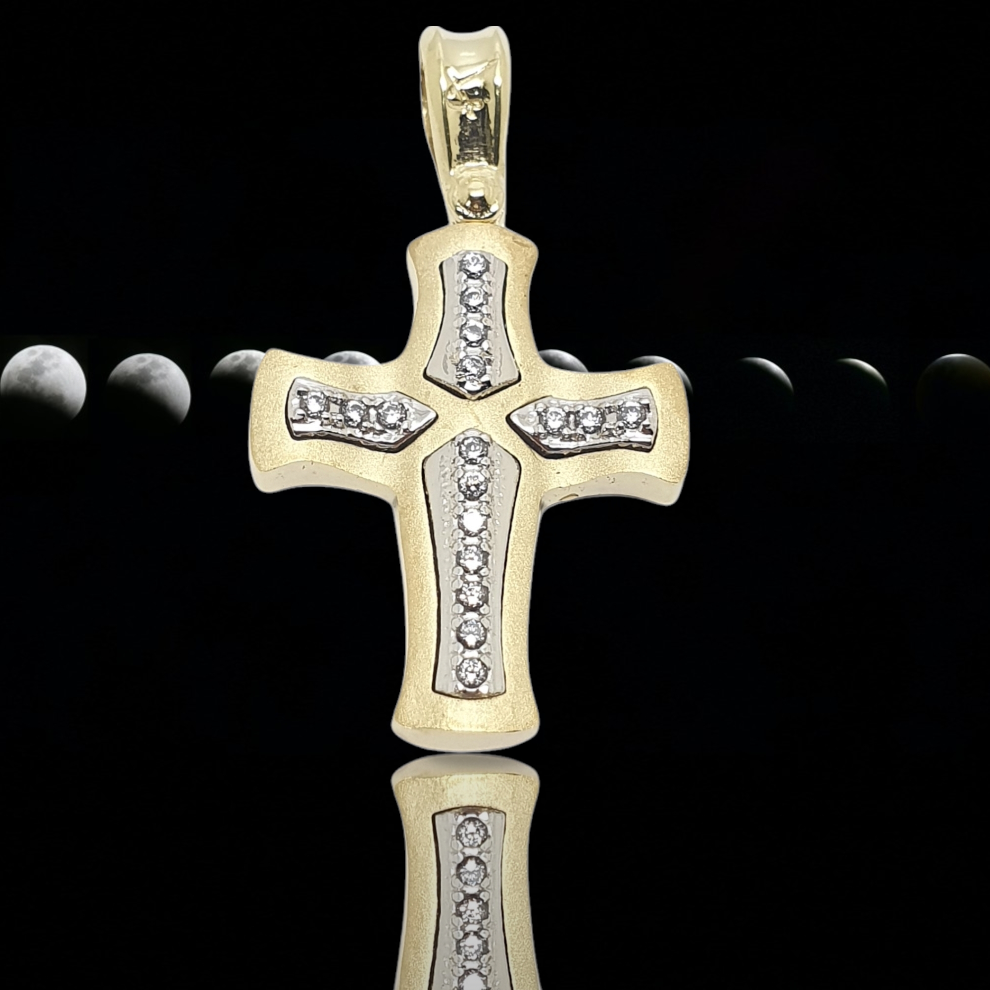 Χρυσός σταυρός με καρφωμένα λευκά ζιργκόν πάνω σε κομμάτια απο λευκόχρυσο.