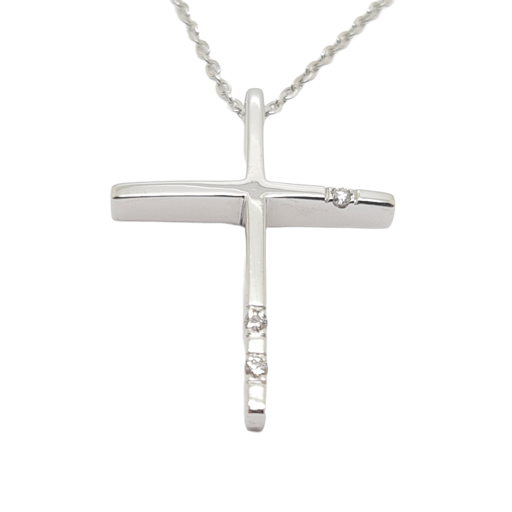Σταυρός απο λευκό χρυσό κ14 με μπριγιάν 0.05ct VS/G. Στην τιμή συμπεριλαμβάνεται η αλυσίδα 45cm.