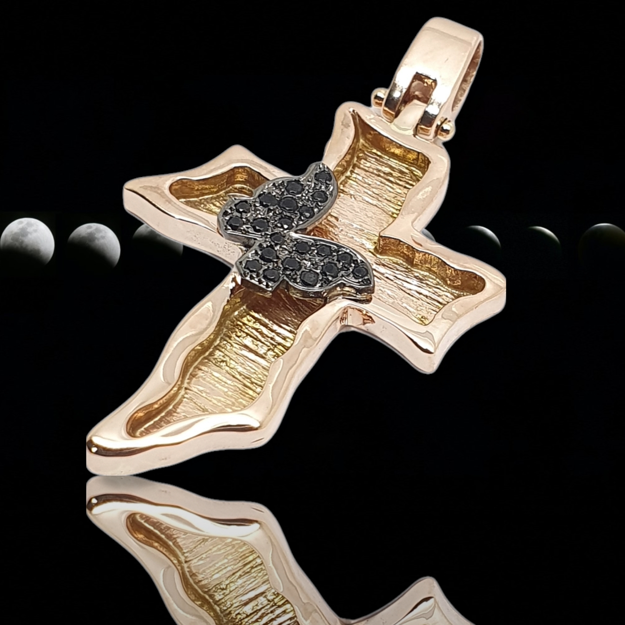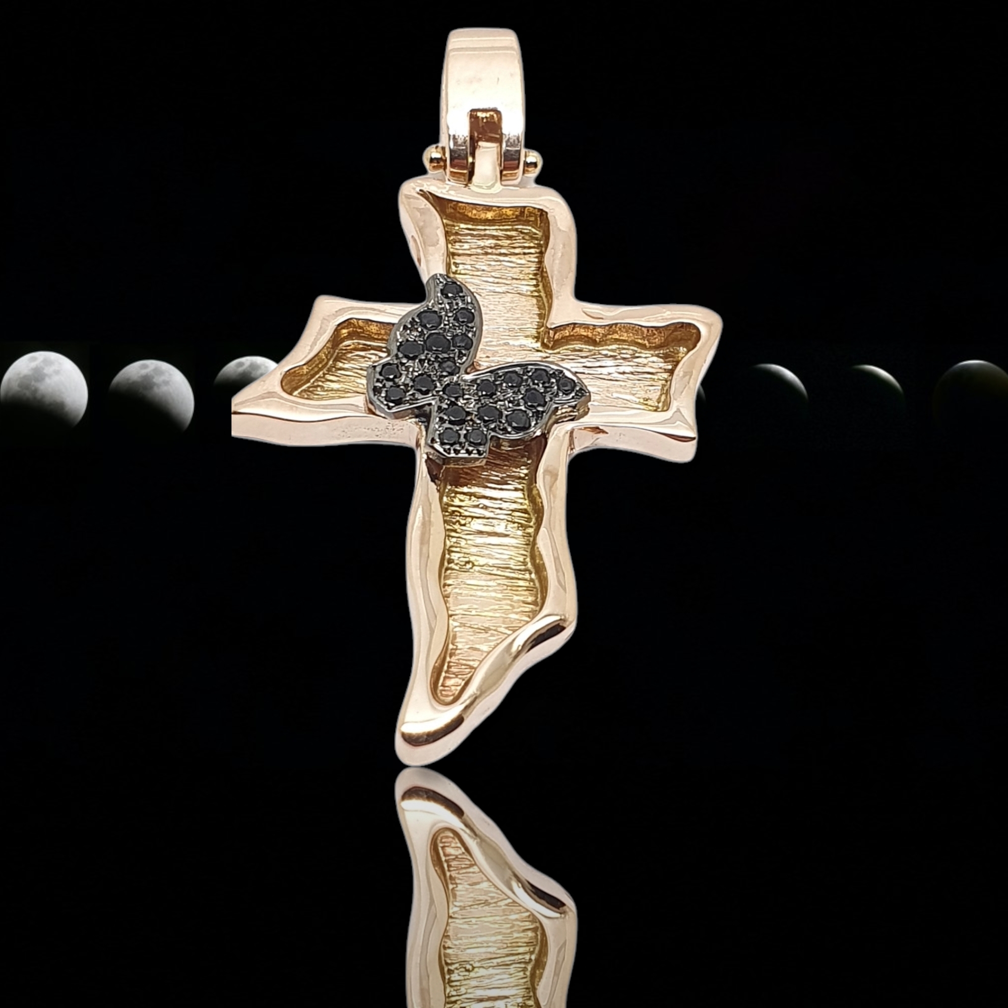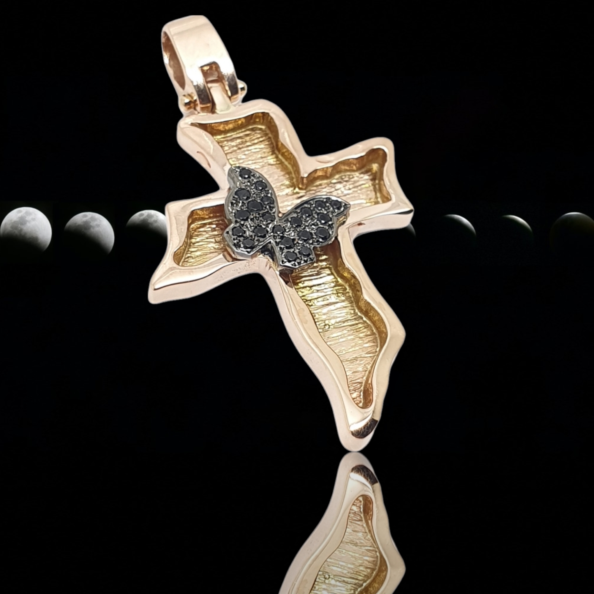 Σταυρός απο ροζ χρυσό με πεταλούδα στολισμένη με μαύρα ζιργκόν.